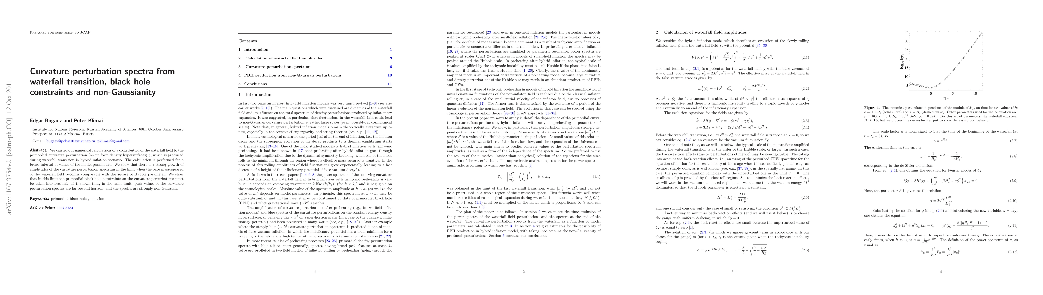 We carried out numerical calculations of a contribution of the waterfall field to the primordial curvature perturbation (on uniform density hypersurfaces) $\zeta$, which is produced during waterfall transition in hybrid inflation scenario. The calculation is performed for a broad interval of values of the model parameters. We show that there is a strong growth of amplitudes of the curvature perturbation spectrum in the limit when the bare mass-squared of the waterfall field becomes comparable with the square of Hubble parameter. We show that in this limit the primordial black hole constraints on the curvature perturbations must be taken into account. It is shown that, in the same limit, peak values of the curvature perturbation spectra are far beyond horizon, and the spectra are strongly non-Gaussian.