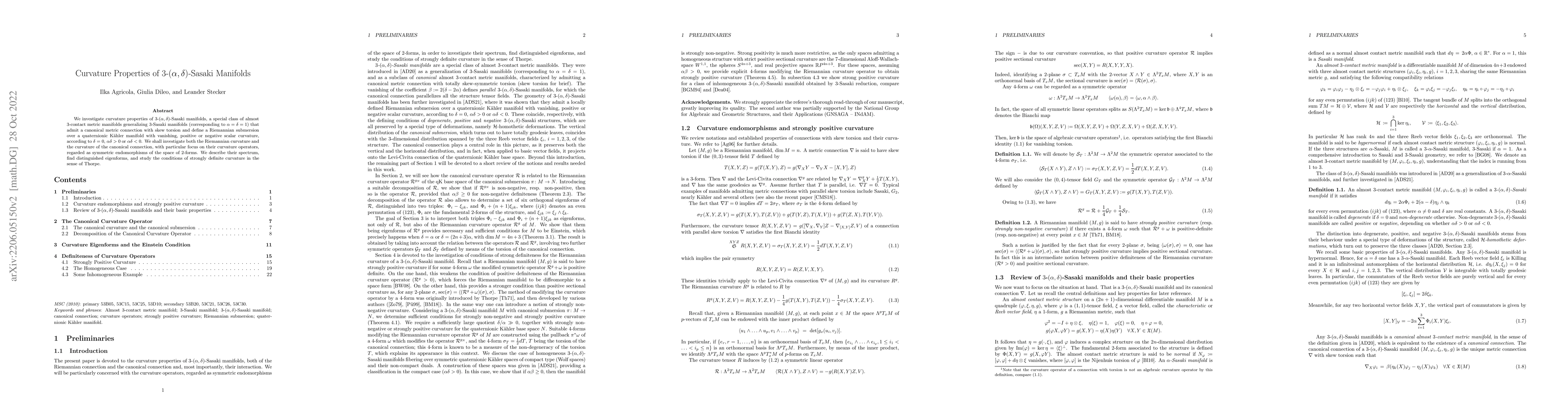 We investigate curvature properties of 3-$(\alpha,\delta)$-Sasaki manifolds, a special class of almost 3-contact metric manifolds generalizing 3-Sasaki manifolds (corresponding to $\alpha = \delta = 1$) that admit a canonical metric connection with skew torsion and define a Riemannian submersion over a quaternionic K\"ahler manifold with vanishing, positive or negative scalar curvature, according to $\delta = 0$, $\alpha\delta > 0$ or $\alpha\delta < 0$. We shall investigate both the Riemannian curvature and the curvature of the canonical connection, with particular focus on their curvature operators, regarded as symmetric endomorphisms of the space of 2-forms. We describe their spectrum, find distinguished eigenforms, and study the conditions of strongly definite curvature in the sense of Thorpe.