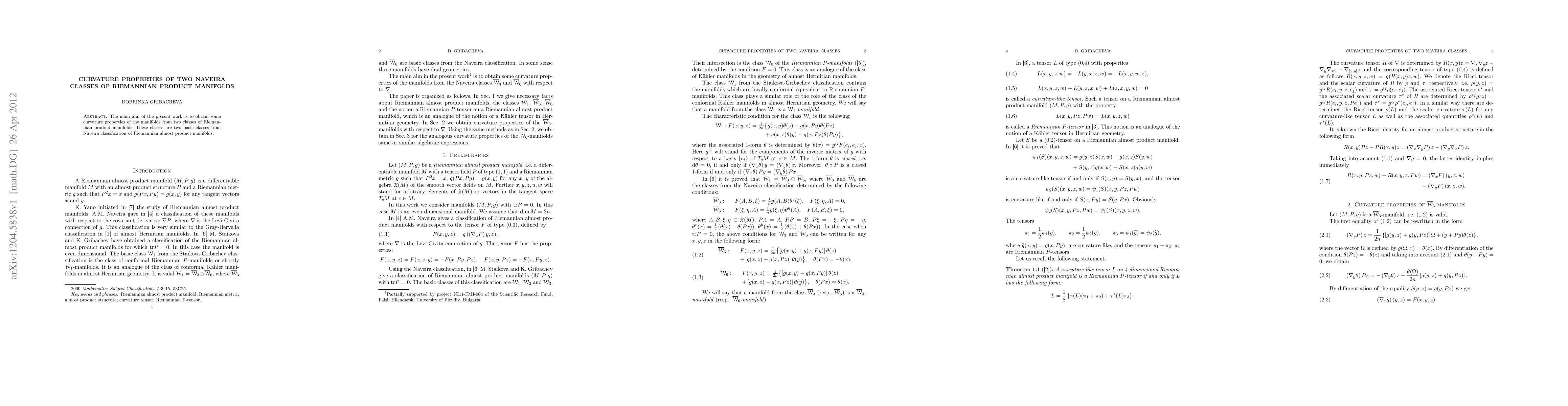 Summary: This paper investigates the curvature properties of two specific classes of Riemannian product manifolds categorized under Naveira's classification of Riemannian almost product manifolds. The study aims to uncover unique curvature characteristics inherent to these classes.