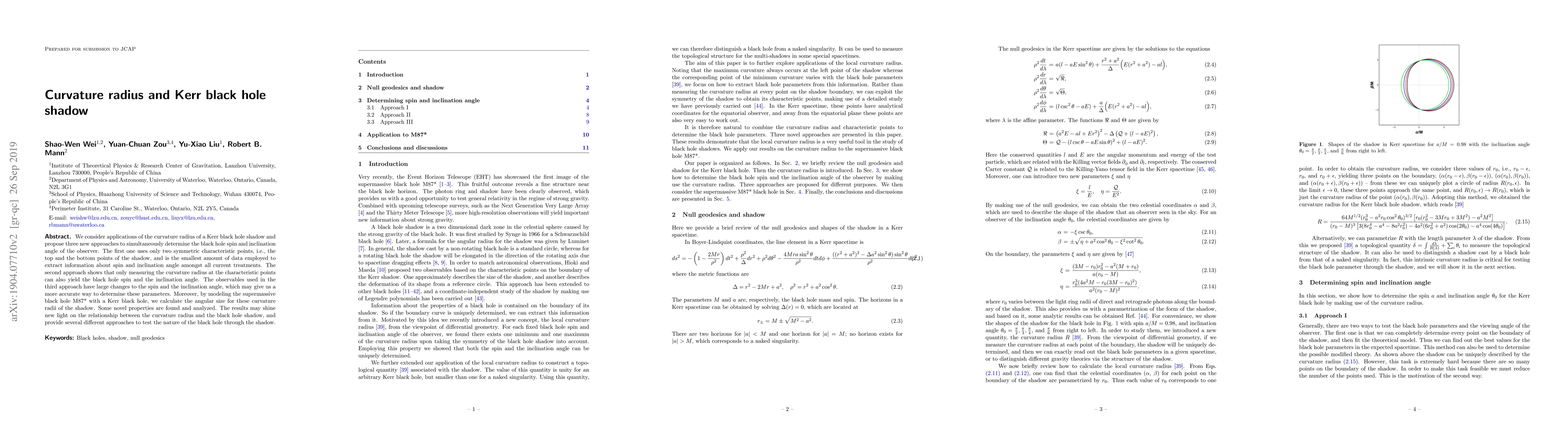 This paper proposes three new methods to determine the spin and inclination angle of a Kerr black hole using its shadow's curvature radius, employing minimal data and potentially offering more accurate parameter extraction. The study also models the supermassive black hole M87* and analyzes its shadow's angular size.