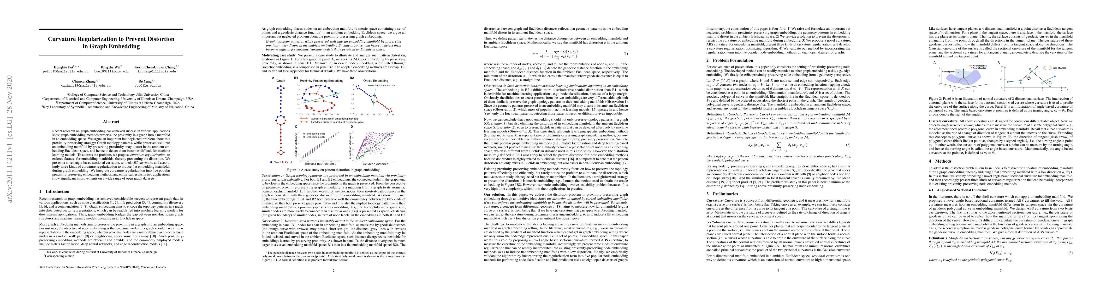 This paper proposes curvature regularization to prevent distortion in graph embedding, addressing the issue of topology patterns being distorted in Euclidean space despite proximity preservation. It introduces a novel angle-based sectional curvature (ABS curvature) and integrates curvature regularization into five popular embedding methods, demonstrating significant improvements in two applications.