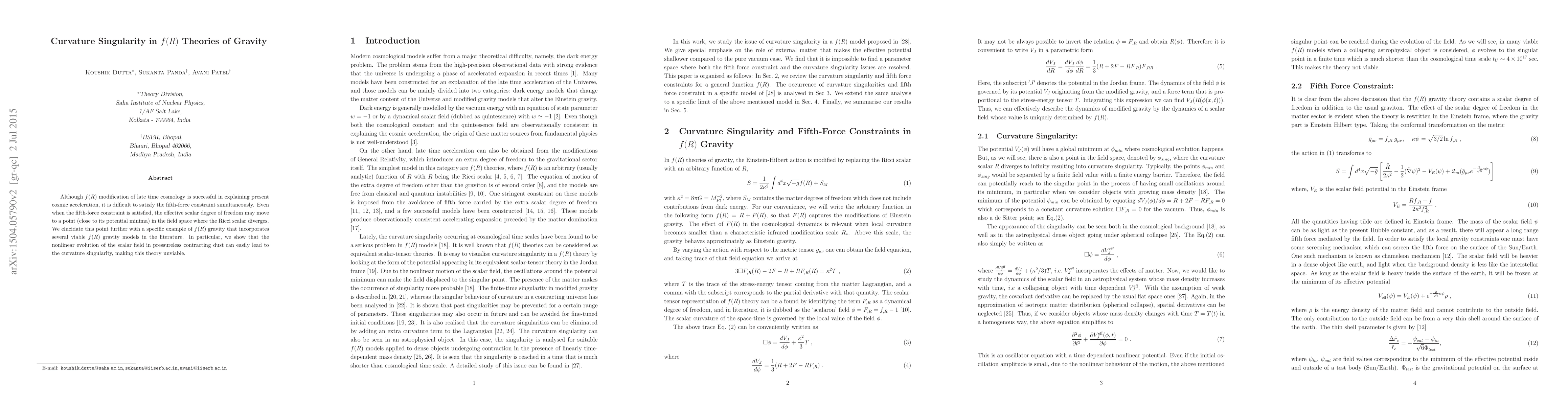Although $f(R)$ modification of late time cosmology is successful in explaining present cosmic acceleration, it is difficult to satisfy the fifth-force constraint simultaneously. Even when the fifth-force constraint is satisfied, the effective scalar degree of freedom may move to a point (close to its potential minima) in the field space where the Ricci scalar diverges. We elucidate this point further with a specific example of $f(R)$ gravity that incorporates several viable $f(R)$ gravity models in the literature. In particular, we show that the nonlinear evolution of the scalar field in pressureless contracting dust can easily lead to the curvature singularity, making this theory unviable.