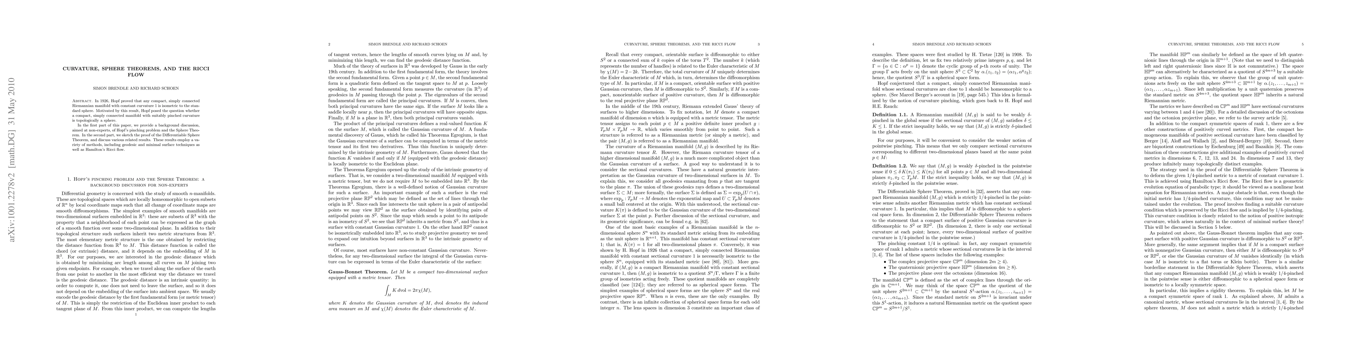 This paper surveys the relationship between curvature and topology in Riemannian manifolds, introducing Hopf's pinching problem and the Sphere Theorem for non-experts. It then explores the proof of the Differentiable Sphere Theorem using Hamilton's Ricci flow and other techniques.