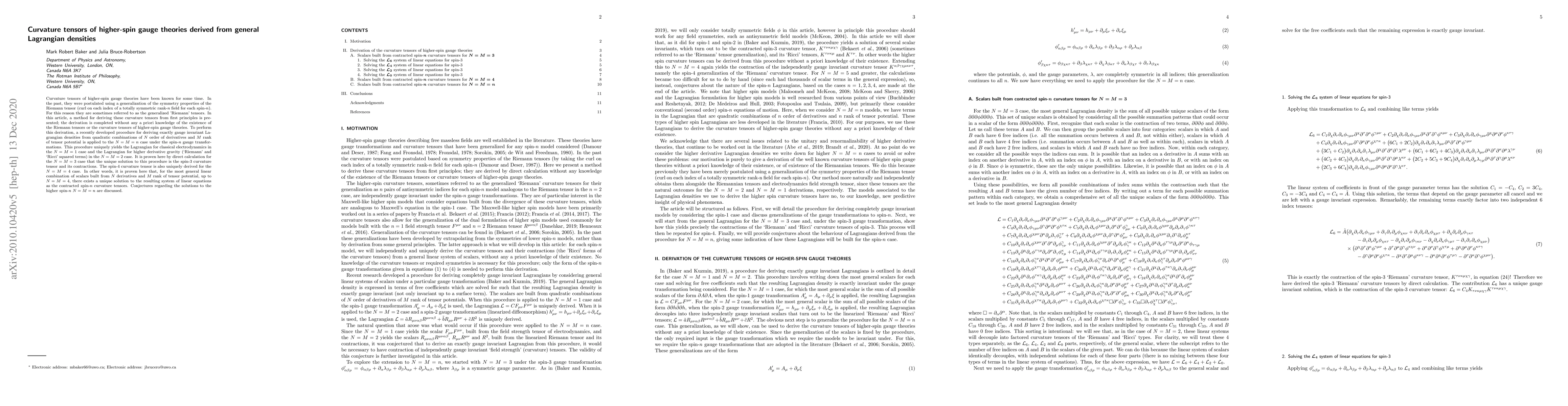 This paper presents a method for deriving curvature tensors for higher-spin gauge theories from general Lagrangian densities without prior knowledge of Riemann tensors. It applies a procedure for constructing gauge invariant Lagrangians to derive the spin-3 and spin-4 curvature tensors, proving their uniqueness and discussing conjectures for higher spins.