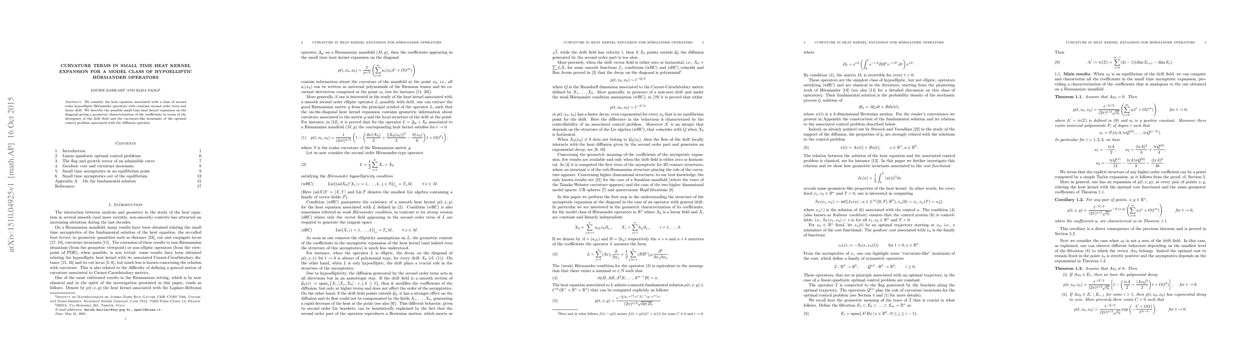 This paper investigates the small time heat kernel expansion for a class of hypoelliptic Hörmander operators, revealing geometric characterizations of the expansion coefficients in terms of the divergence of the drift field and curvature-like invariants from the optimal control problem.