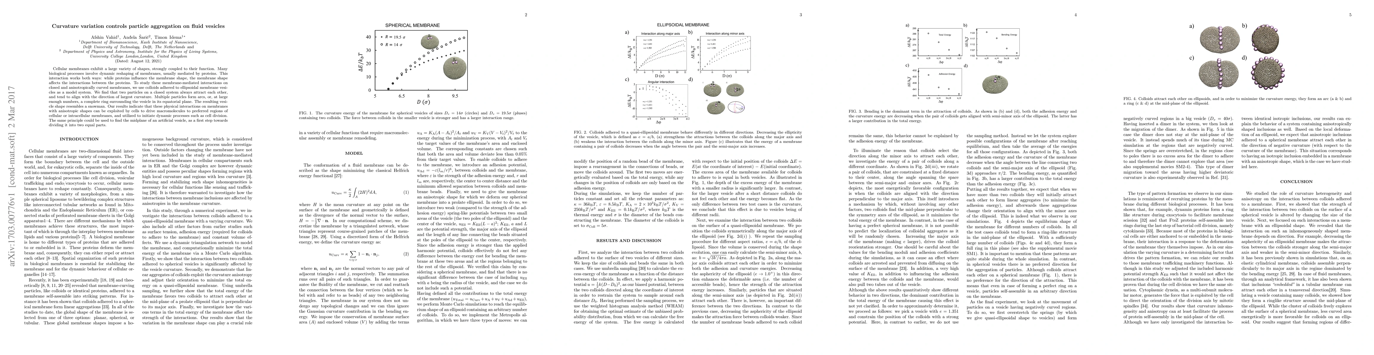 Cellular membranes exhibit a large variety of shapes, strongly coupled to their function. Many biological processes involve dynamic reshaping of membranes, usually mediated by proteins. This interaction works both ways: while proteins influence the membrane shape, the membrane shape affects the interactions between the proteins. To study these membrane-mediated interactions on closed and anisotropically curved membranes, we use colloids adhered to ellipsoidal membrane vesicles as a model system. We find that two particles on a closed system always attract each other, and tend to align with the direction of largest curvature. Multiple particles form arcs, or, at large enough numbers, a complete ring surrounding the vesicle in its equatorial plane. The resulting vesicle shape resembles a snowman. Our results indicate that these physical interactions on membranes with anisotropic shapes can be exploited by cells to drive macromolecules to preferred regions of cellular or intracellular membranes, and utilized to initiate dynamic processes such as cell division. The same principle could be used to find the midplane of an artificial vesicle, as a first step towards dividing it into two equal parts.
