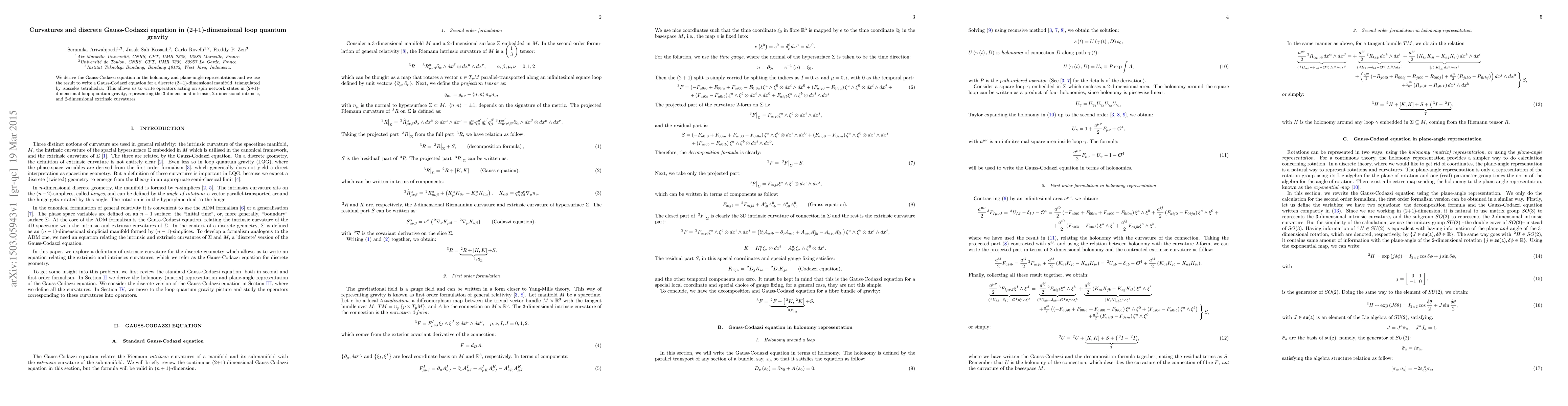 This paper derives the Gauss-Codazzi equations in holonomy and plane-angle representations for a discrete (2+1)-dimensional manifold, enabling the construction of operators in loop quantum gravity that represent intrinsic and extrinsic curvatures on spin network states.