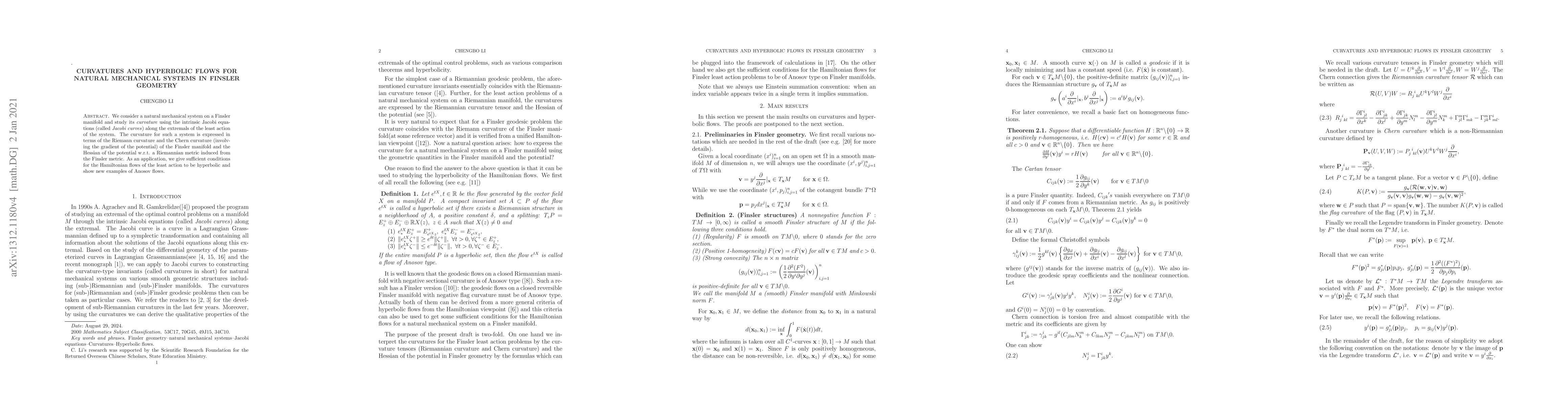 Researchers study natural mechanical systems on Finsler manifolds to understand their curvature using Jacobi curves and relate it to Riemann and Chern curvatures, providing new insights into hyperbolic flows and Anosov flows.