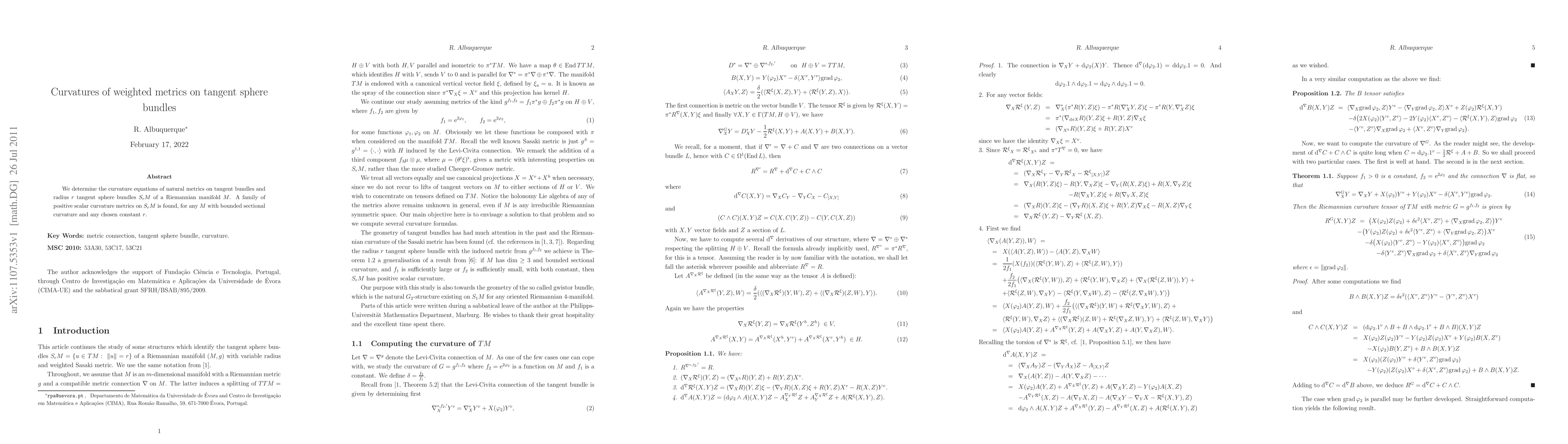 This research determines the curvature equations for natural metrics on tangent bundles and their corresponding radius r tangent sphere bundles. It also identifies a family of positive scalar curvature metrics for any Riemannian manifold with bounded sectional curvature, for any chosen constant radius r.