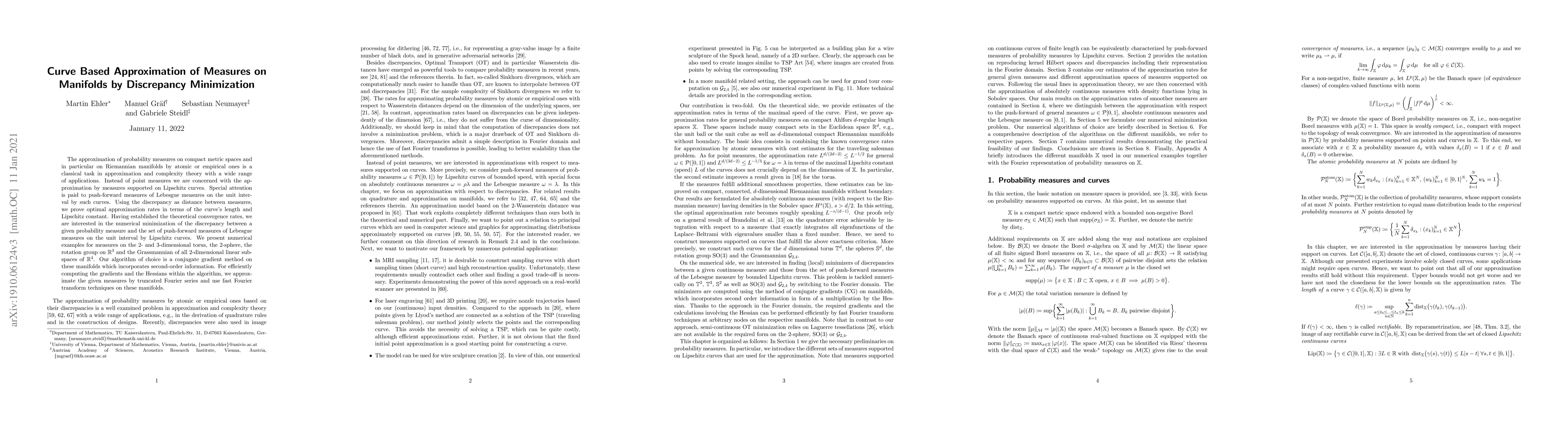 The approximation of probability measures on compact metric spaces and in particular on Riemannian manifoldsby atomic or empirical ones is a classical task in approximation and complexity theory with a wide range of applications. Instead of point measures we are concerned with the approximation by measures supported on Lipschitz curves. Special attention is paid to push-forward measures of Lebesgue measures on the interval by such curves. Using the discrepancy as distance between measures, we prove optimal approximation rates in terms of Lipschitz constants of curves. Having established the theoretical convergence rates, we are interested in the numerical minimization of the discrepancy between a given probability measure and the set of push-forward measures of Lebesgue measures on the interval by Lipschitz curves. We present numerical examples for measures on the 2- and 3-dimensional torus, the 2-sphere, the rotation group on $\mathbb R^3$ and the Grassmannian of all 2-dimensional linear subspaces of $\mathbb{R}^4$. Our algorithm of choice is a conjugate gradient method on these manifolds which incorporates second-oder information. For efficiently computing the gradients and the Hessians within the algorithm, we approximate the given measures by truncated Fourier series and use fast Fourier transform techniques on these manifolds.