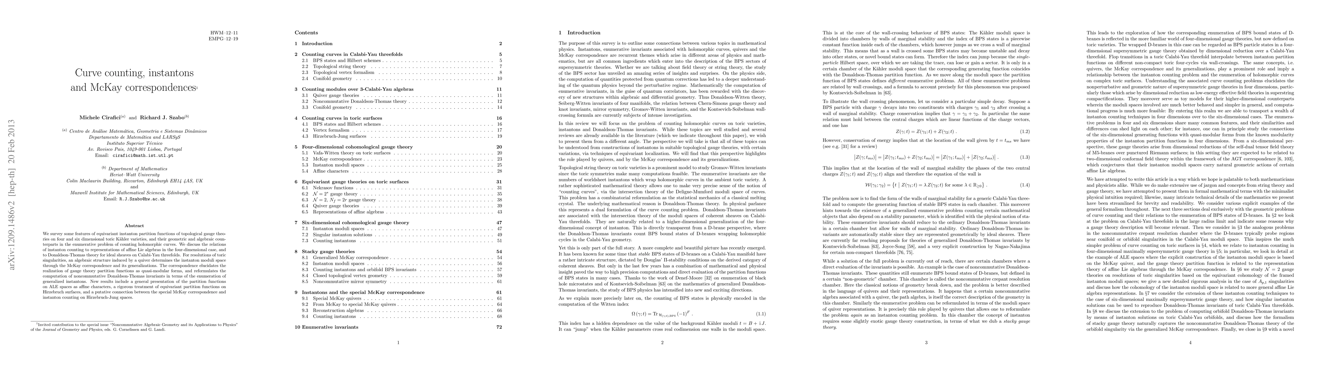 We survey some features of equivariant instanton partition functions of topological gauge theories on four and six dimensional toric Kahler varieties, and their geometric and algebraic counterparts in the enumerative problem of counting holomorphic curves. We discuss the relations of instanton counting to representations of affine Lie algebras in the four-dimensional case, and to Donaldson-Thomas theory for ideal sheaves on Calabi-Yau threefolds. For resolutions of toric singularities, an algebraic structure induced by a quiver determines the instanton moduli space through the McKay correspondence and its generalizations. The correspondence elucidates the realization of gauge theory partition functions as quasi-modular forms, and reformulates the computation of noncommutative Donaldson-Thomas invariants in terms of the enumeration of generalized instantons. New results include a general presentation of the partition functions on ALE spaces as affine characters, a rigorous treatment of equivariant partition functions on Hirzebruch surfaces, and a putative connection between the special McKay correspondence and instanton counting on Hirzebruch-Jung spaces.