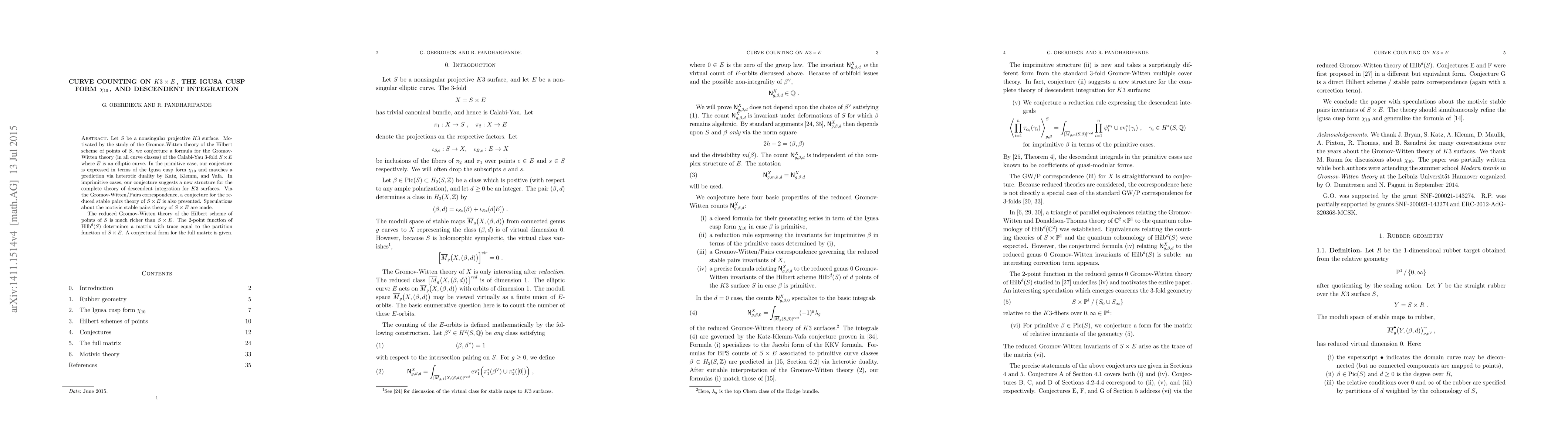 Let S be a nonsingular projective K3 surface. Motivated by the study of the Gromov-Witten theory of the Hilbert scheme of points of S, we conjecture a formula for the Gromov-Witten theory (in all curve classes) of the Calabi-Yau 3-fold S x E where E is an elliptic curve. In the primitive case, our conjecture is expressed in terms of the Igusa cusp form chi_{10} and matches a prediction via heterotic duality by Katz, Klemm, and Vafa. In imprimitive cases, our conjecture suggests a new structure for the complete theory of descendent integration for K3 surfaces. Via the Gromov-Witten/Pairs correspondence, a conjecture for the reduced stable pairs theory of S x E is also presented. Speculations about the motivic stable pairs theory of S x E are made. The reduced Gromov-Witten theory of the Hilbert scheme of points of S is much richer than S x E. The 2-point function of Hilb(S,d) determines a matrix with trace equal to the partition function of S x E. A conjectural form for the full matrix is given.