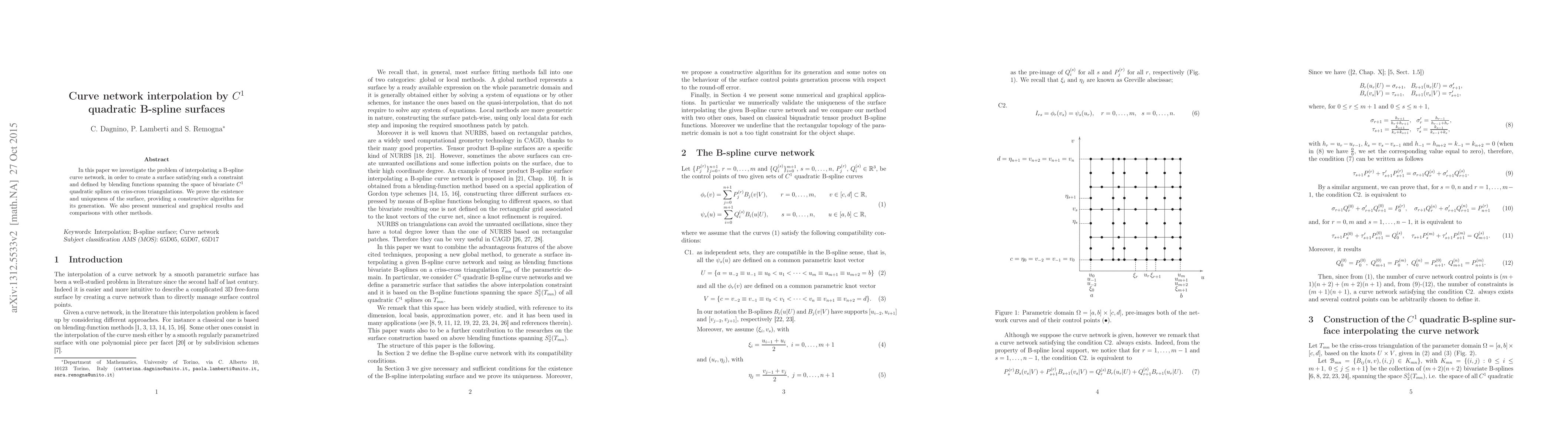 In this paper we investigate the problem of interpolating a B-spline curve network, in order to create a surface satisfying such a constraint and defined by blending functions spanning the space of bivariate $C^1$ quadratic splines on criss-cross triangulations. We prove the existence and uniqueness of the surface, providing a constructive algorithm for its generation. We also present numerical and graphical results and comparisons with other methods.