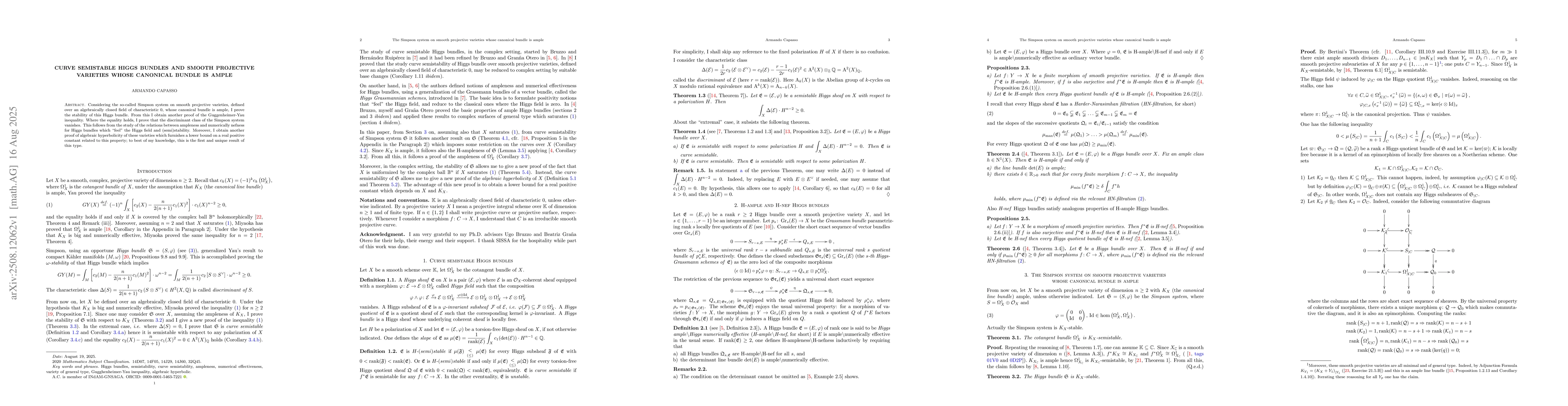 Considering the so-called Simpson system on smooth projective varieties, defined over an algebraically closed field of characteristic $0$, whose canonical bundle is ample, I prove the stability of this Higgs bundle. From this I obtain another proof of the Guggenheimer-Yau inequality. Where the equality holds, I prove that the discriminant class of the Simpson system vanishes. This follows from the study of the relations between ampleness and numerically nefness for Higgs bundles which "feel" the Higgs field and (semi)stability. Moreover, I obtain another proof of algebraic hyperbolicity of these varieties which furnishes a lower bound on a real positive constant related to this property; to best of my knowledge, this is the first and unique result of this type.