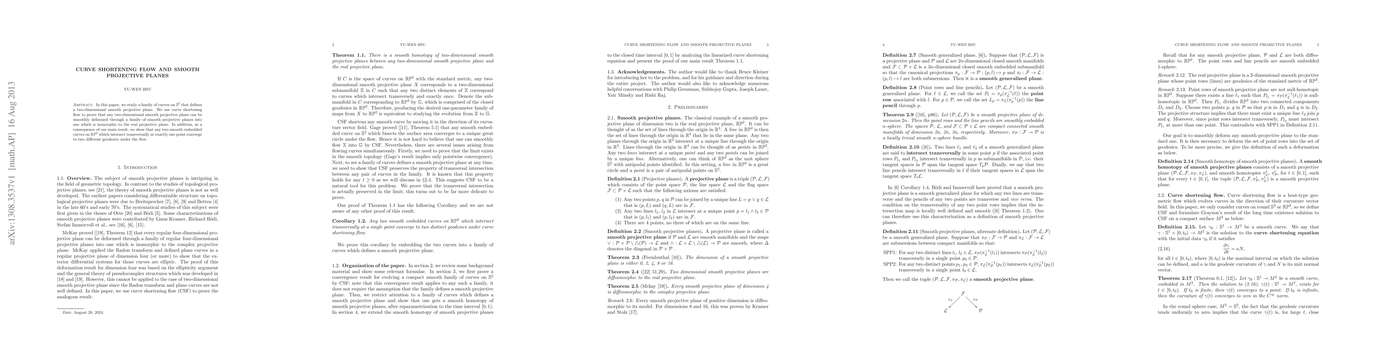 In this paper, we study a family of curves on $S^2$ that defines a two-dimensional smooth projective plane. We use curve shortening flow to prove that any two-dimensional smooth projective plane can be smoothly deformed through a family of smooth projective planes into one which is isomorphic to the real projective plane. In addition, as a consequence of our main result, we show that any two smooth embedded curves on $RP^2$ which intersect transversally at exactly one point converge to two different geodesics under the flow.