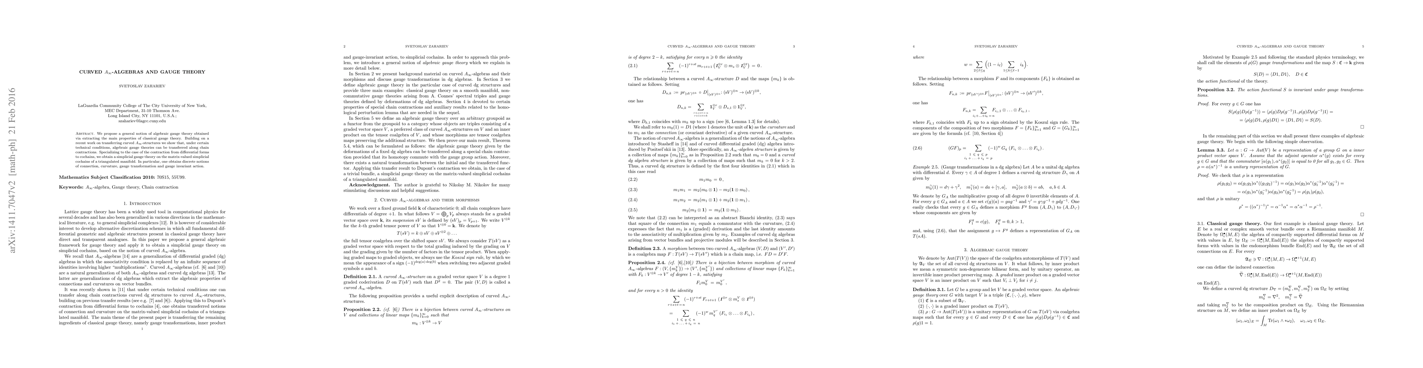 This paper introduces a framework for algebraic gauge theory based on curved $A_{\infty}$-algebras, demonstrating how these theories can be transferred via chain contractions. It specifically derives a simplicial gauge theory on matrix-valued simplicial cochains of triangulated manifolds, yielding discrete concepts of connection, curvature, gauge transformation, and gauge invariant action.