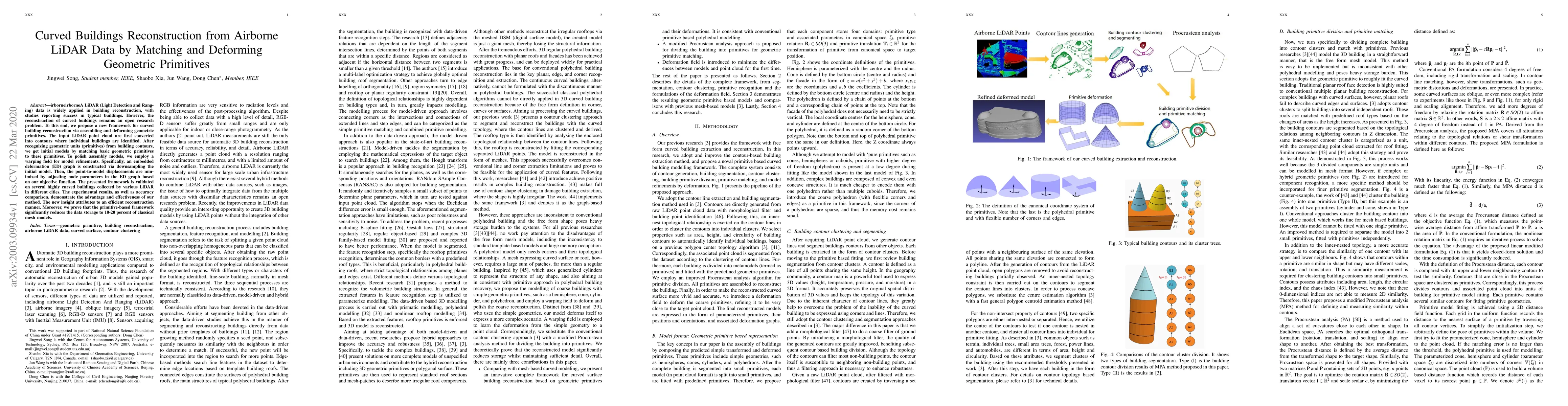 This paper presents a novel framework for reconstructing curved buildings using airborne LiDAR data by matching and deforming geometric primitives. The method involves converting LiDAR point clouds into building contours, identifying geometric units, and refining models through an embedded deformation graph. The proposed approach demonstrates improved accuracy and significantly reduces data storage compared to traditional mesh models.