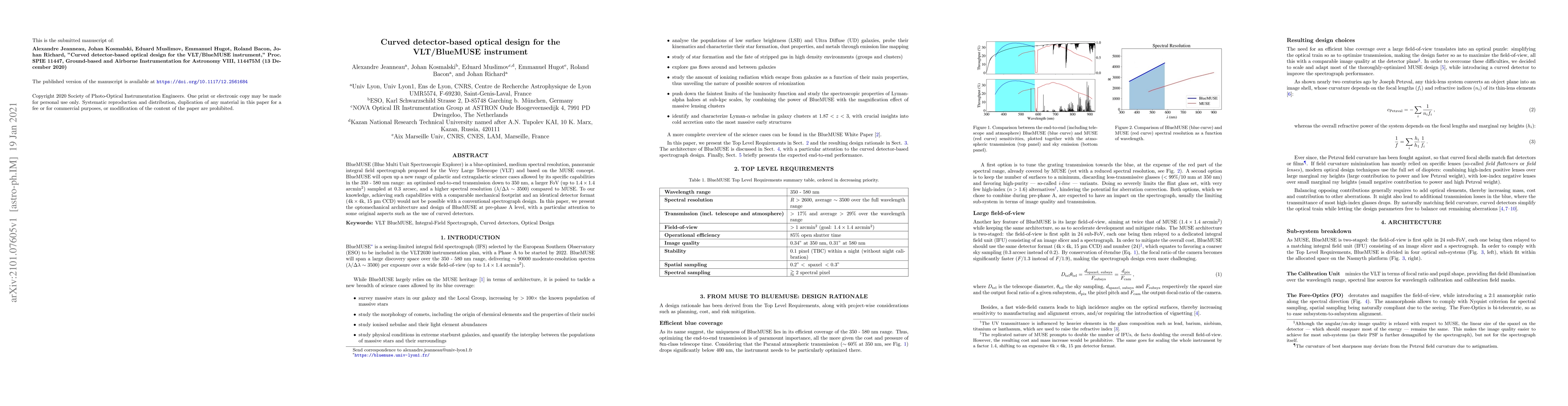 This paper details the optomechanical design of BlueMUSE, a blue-optimized spectrograph for the VLT, featuring curved detectors to achieve a larger field of view and higher spectral resolution within a compact footprint. The design aims to enhance galactic and extragalactic science capabilities in the 350-580 nm range.