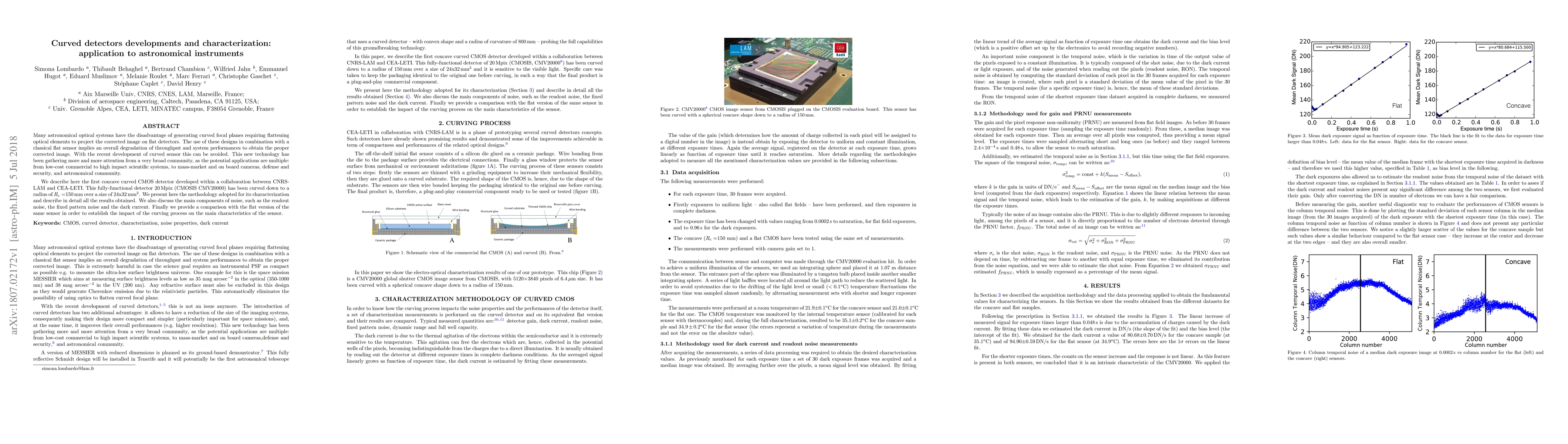 Many astronomical optical systems have the disadvantage of generating curved focal planes requiring flattening optical elements to project the corrected image on flat detectors. The use of these designs in combination with a classical flat sensor implies an overall degradation of throughput and system performances to obtain the proper corrected image. With the recent development of curved sensor this can be avoided. This new technology has been gathering more and more attention from a very broad community, as the potential applications are multiple: from low-cost commercial to high impact scientific systems, to mass-market and on board cameras, defense and security, and astronomical community. We describe here the first concave curved CMOS detector developed within a collaboration between CNRS- LAM and CEA-LETI. This fully-functional detector 20 Mpix (CMOSIS CMV20000) has been curved down to a radius of Rc = 150 mm over a size of 24x32 mm^2 . We present here the methodology adopted for its characterization and describe in detail all the results obtained. We also discuss the main components of noise, such as the readout noise, the fixed pattern noise and the dark current. Finally we provide a comparison with the flat version of the same sensor in order to establish the impact of the curving process on the main characteristics of the sensor.