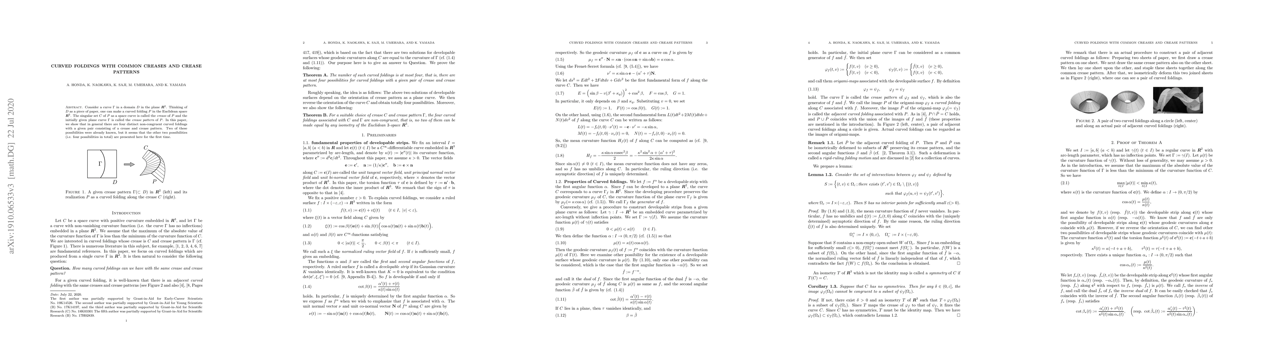 The paper investigates curved foldings in 3D space with common creases and crease patterns, utilizing differential geometry and the Frenet-Serret formulas to analyze the curvature and torsion of space curves.