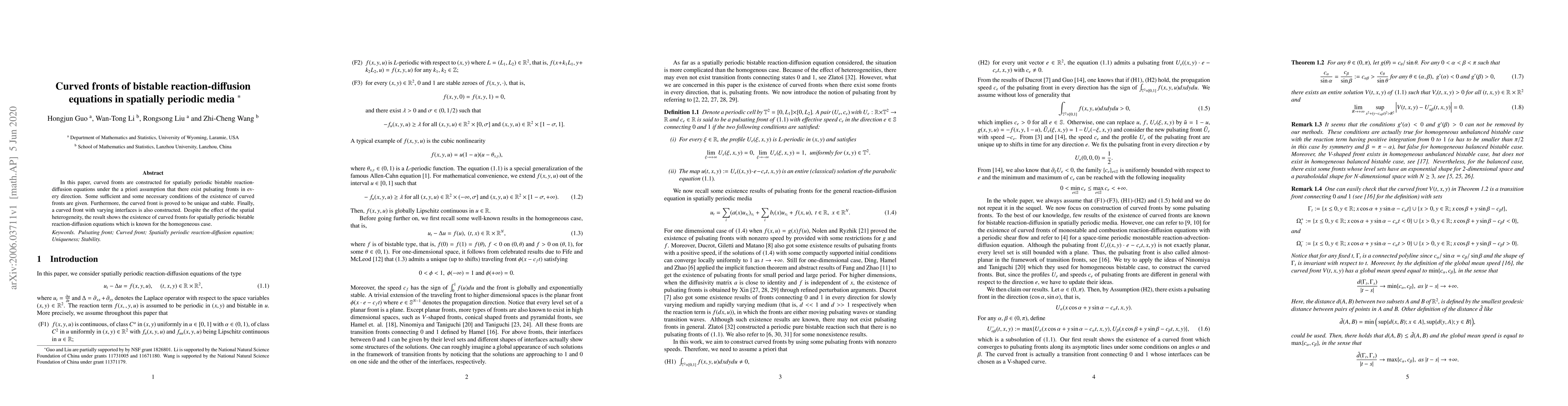 This paper constructs curved fronts for spatially periodic bistable reaction-diffusion equations, proving their existence, uniqueness, and stability, even in the presence of spatial heterogeneity. Additionally, it presents a curved front with varying interfaces.