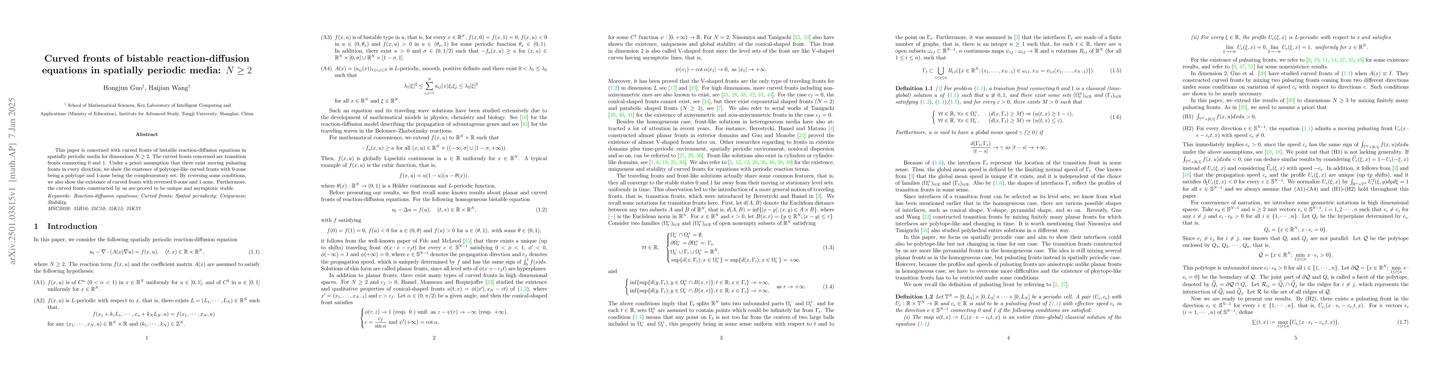 This paper examines the existence and uniqueness of polytope-like curved fronts in bistable reaction-diffusion equations within spatially periodic media for dimensions $N\geq 2$. It proves the existence of such fronts connecting $0$ and $1$ zones, and demonstrates their asymptotic stability and uniqueness under certain conditions.