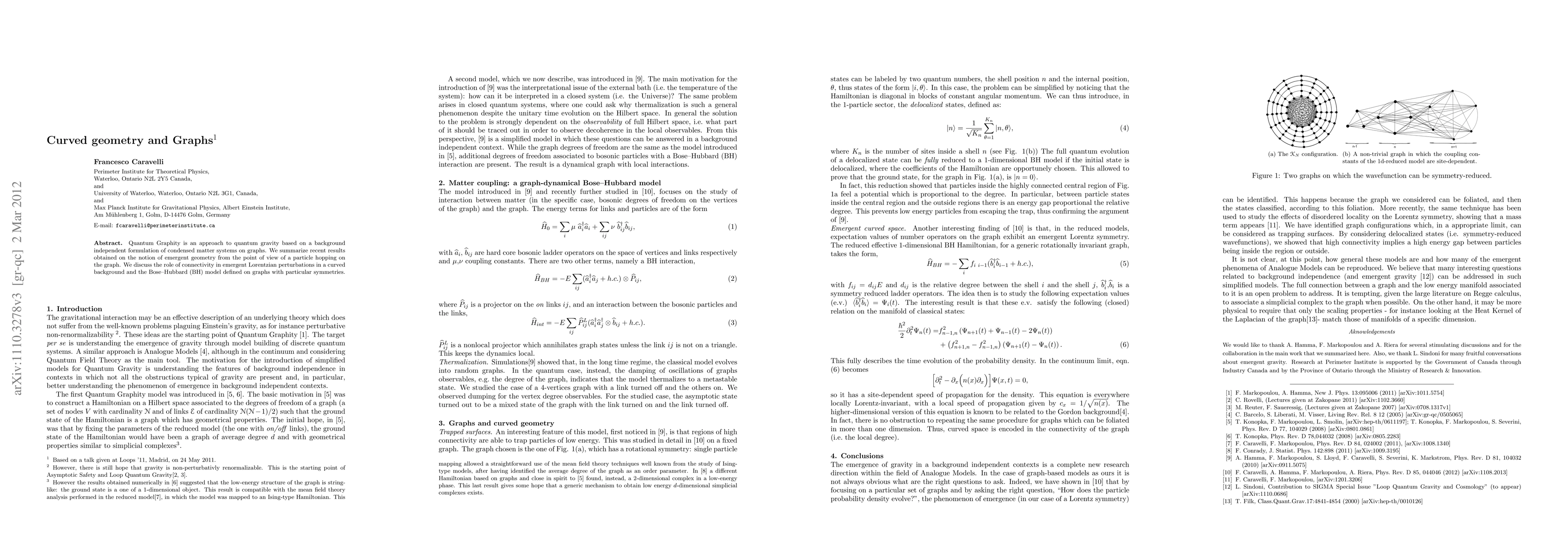 Quantum Graphity is an approach to quantum gravity based on a background independent formulation of condensed matter systems on graphs. We summarize recent results obtained on the notion of emergent geometry from the point of view of a particle hopping on the graph. We discuss the role of connectivity in emergent Lorentzian perturbations in a curved background and the Bose--Hubbard (BH) model defined on graphs with particular symmetries.