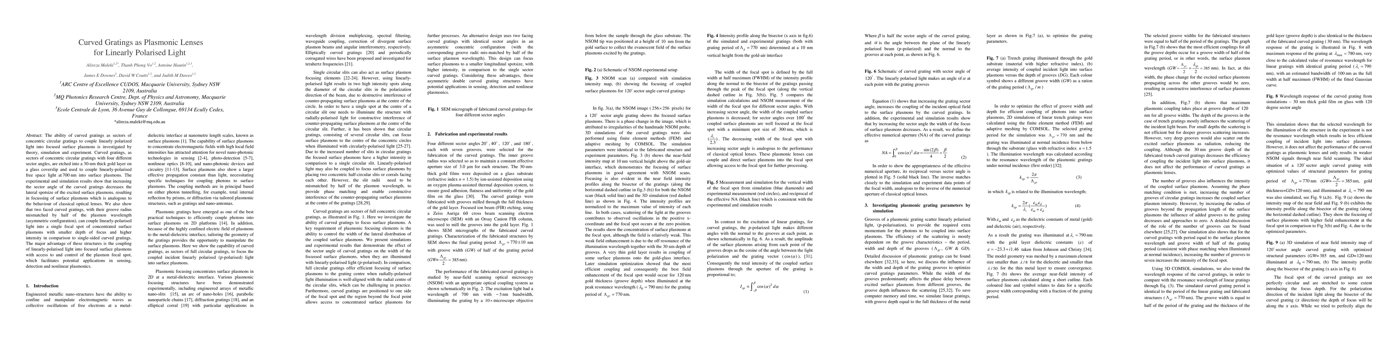 This research investigates the effectiveness of curved gratings as plasmonic lenses for linearly polarized light, demonstrating their ability to focus surface plasmons analogous to classical lenses. Experimental and simulation results reveal that larger sector angles reduce the lateral spot size, while asymmetric configurations enhance focal spot intensity and control, highlighting potential applications in sensing and nonlinear plasmonics.