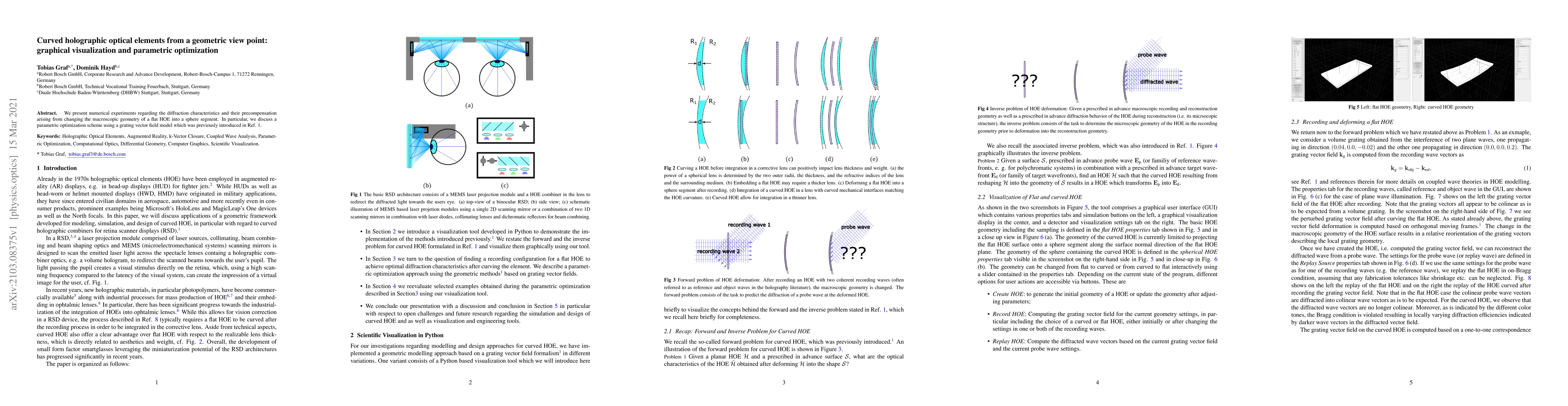 We present numerical experiments regarding the diffraction characteristics and their precompensation arising from changing the macroscopic geometry of a flat HOE into a sphere segment. In particular, we discuss a parametric optimization scheme using a grating vector field model which was previously introduced in Ref. 1.