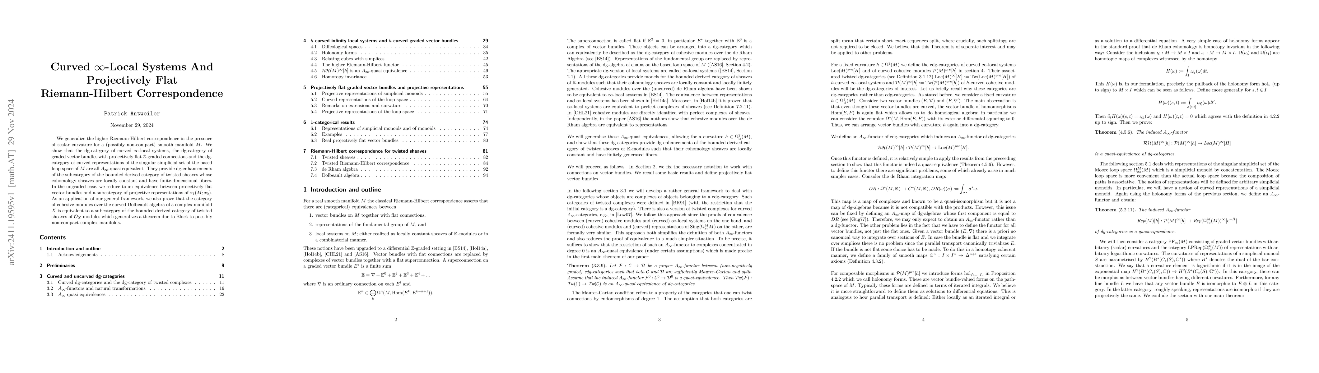 This paper generalizes the Riemann-Hilbert correspondence for curved $\infty$-local systems on smooth manifolds, showing $A_\infty$-quasi equivalences among various dg-categories and establishing an equivalence for projectively flat vector bundles with projective representations. It also extends a theorem on cohesive modules to non-compact complex manifolds.