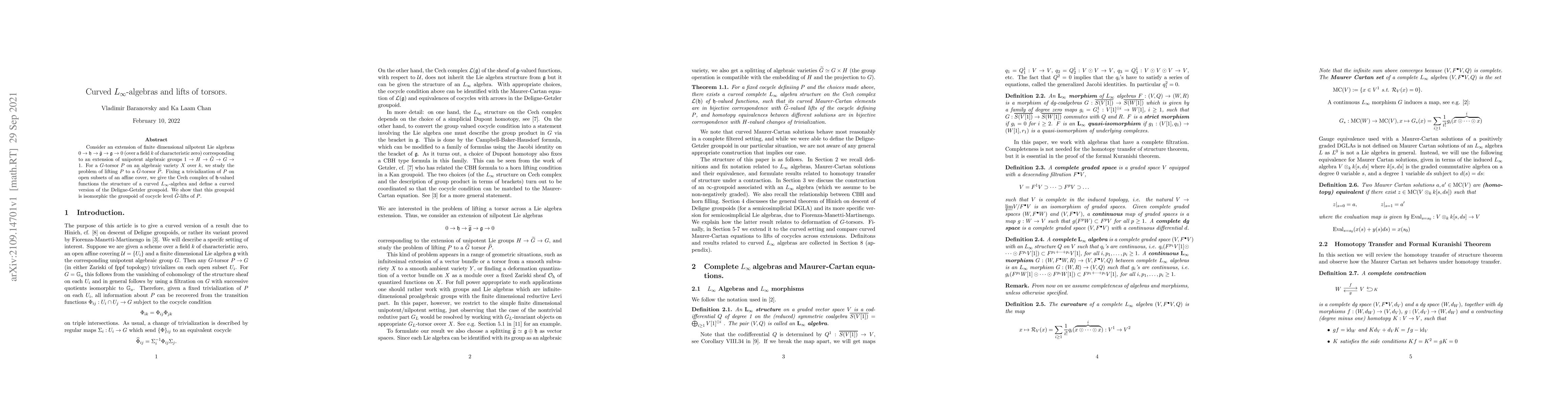 Consider an extension of finite dimensional nilpotent Lie algebras $0 \to \mathfrak{h} \to \tilde{\mathfrak{g}} \to \mathfrak{g} \to 0$ (over a field $k$ of characteristic zero) corresponding to an extension of unipotent algebraic groups $1 \to H \to \tilde{G} \to G \to 1$. For a $G$-torsor $P$ on an algebraic variety $X$ over $k$, we study the problem of lifting $P$ to $\widetilde{G}$-torsor $\widetilde{P}$. Fixing a trivialization of $P$ on open subsets of an affine cover, we give the Cech complex of $\mathfrak{h}$-valued functions the structure of a curved $L_\infty$-algebra and define a curved version of the Deligne-Getzler groupoid. We show that this groupoid is isomorphic the groupoid of cocycle level $\tilde{G}$-lifts of $P$.