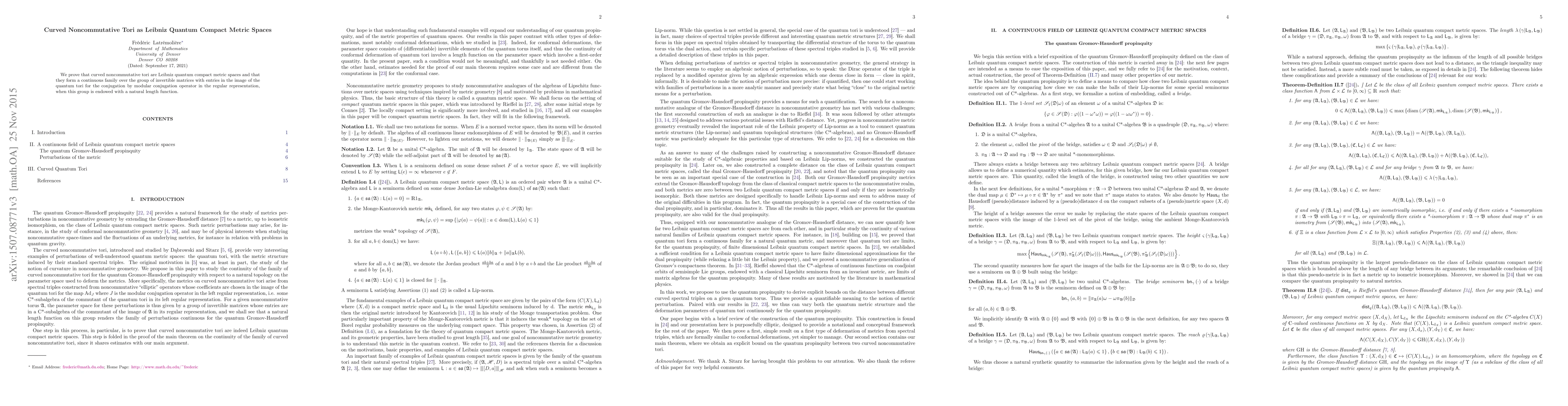 Summary: Curvature is shown to characterize curved noncommutative tori as Leibniz quantum compact metric spaces, forming a continuous family parameterized by invertible matrices in the commutant's group, equipped with a natural length function.