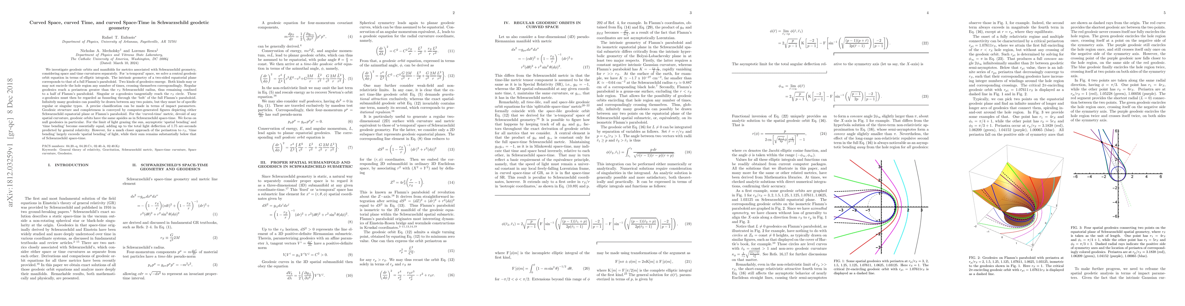 We investigate geodesic orbits and manifolds for metrics associated with Schwarzschild geometry, considering space and time curvatures separately. For `a-temporal' space, we solve a central geodesic orbit equation in terms of elliptic integrals. The intrinsic geometry of a two-sided equatorial plane corresponds to that of a full Flamm's paraboloid. Two kinds of geodesics emerge. Both kinds may or may not encircle the hole region any number of times, crossing themselves correspondingly. Regular geodesics reach a periastron greater than the $r_S$ Schwarzschild radius, thus remaining confined to a half of Flamm's paraboloid. Singular or $s$-geodesics tangentially reach the $r_S$ circle. These $s$-geodesics must then be regarded as funneling through the `belt' of the full Flamm's paraboloid. Infinitely many geodesics can possibly be drawn between any two points, but they must be of specific regular or singular types. A precise classification can be made in terms of impact parameters. Geodesic structure and completeness is conveyed by computer-generated figures depicting either Schwarzschild equatorial plane or Flamm's paraboloid. For the `curved-time' metric, devoid of any spatial curvature, geodesic orbits have the same apsides as in Schwarzschild space-time. We focus on null geodesics in particular. For the limit of light grazing the sun, asymptotic `spatial bending' and `time bending' become essentially equal, adding up to the total light deflection of 1.75 arc-seconds predicted by general relativity. However, for a much closer approach of the periastron to $r_S$, `time bending' largely exceeds `spatial bending' of light, while their sum remains substantially below that of Schwarzschild space-time.