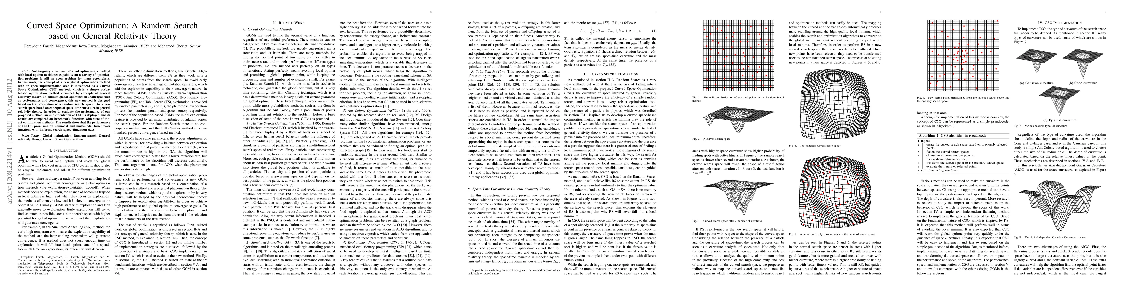 Designing a fast and efficient optimization method with local optima avoidance capability on a variety of optimization problems is still an open problem for many researchers. In this work, the concept of a new global optimization method with an open implementation area is introduced as a Curved Space Optimization (CSO) method, which is a simple probabilistic optimization method enhanced by concepts of general relativity theory. To address global optimization challenges such as performance and convergence, this new method is designed based on transformation of a random search space into a new search space based on concepts of space-time curvature in general relativity theory. In order to evaluate the performance of our proposed method, an implementation of CSO is deployed and its results are compared on benchmark functions with state-of-the art optimization methods. The results show that the performance of CSO is promising on unimodal and multimodal benchmark functions with different search space dimension sizes.