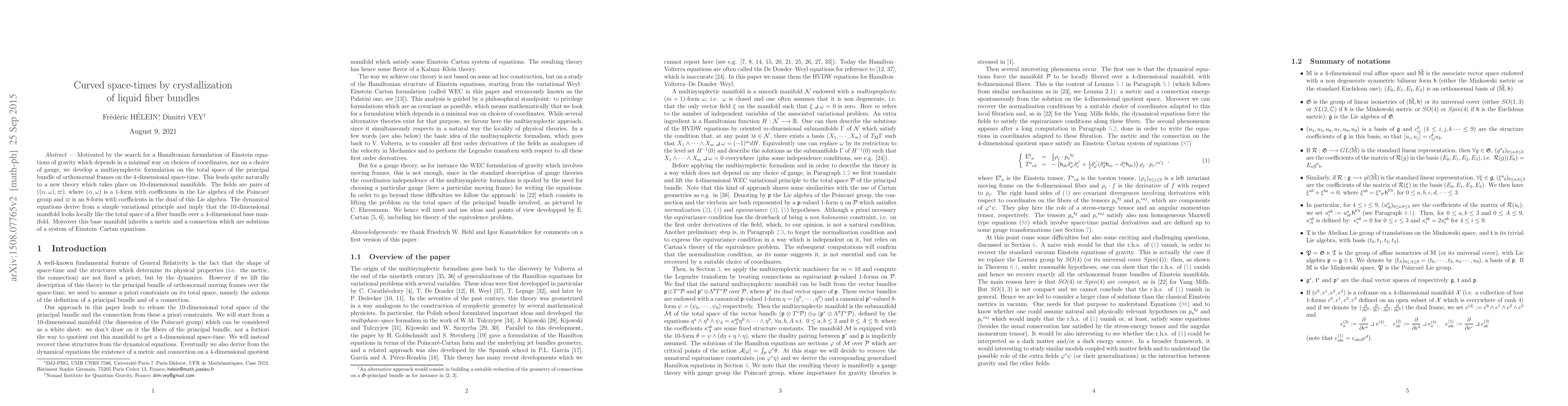 Motivated by the search for a Hamiltonian formulation of Einstein equations of gravity which depends in a minimal way on choices of coordinates, nor on a choice of gauge, we develop a multisymplectic formulation on the total space of the principal bundle of orthonormal frames on the 4-dimensional space-time. This leads quite naturally to a new theory which takes place on 10-dimensional manifolds. The fields are pairs of $((\alpha,\omega),\varpi)$, where $(\alpha,\omega)$ is a 1-form with coefficients in the Lie algebra of the Poincar\'e group and $\varpi$ is an 8-form with coefficients in the dual of this Lie algebra. The dynamical equations derive from a simple variational principle and imply that the 10-dimensional manifold looks locally like the total space of a fiber bundle over a 4-dimensional base manifold. Moreover this base manifold inherits a metric and a connection which are solutions of a system of Einstein--Cartan equations.