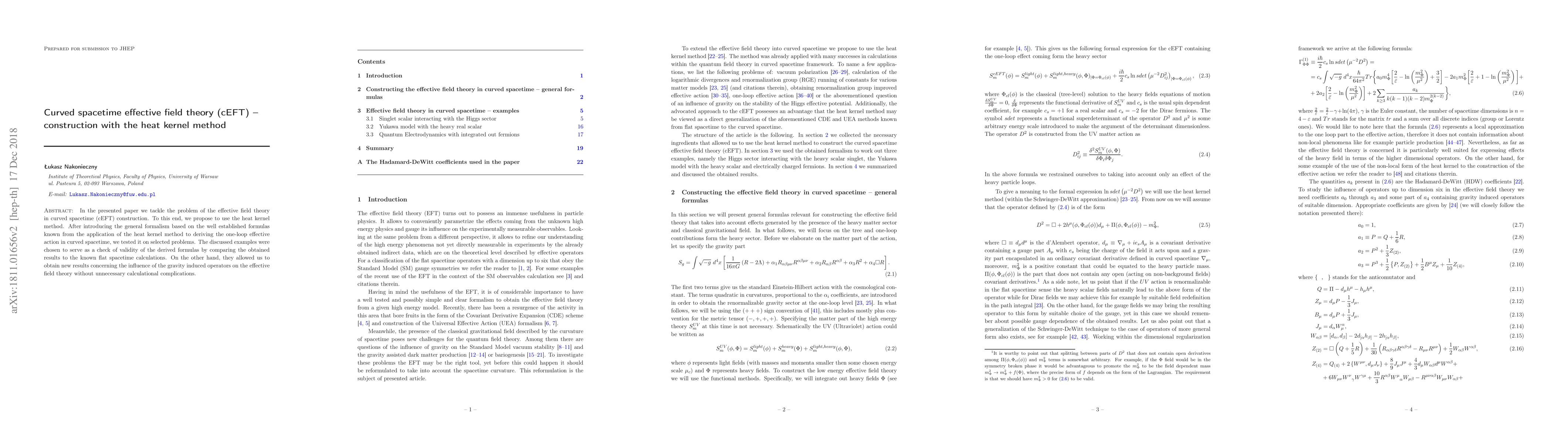 This paper constructs an effective field theory in curved spacetime (cEFT) using the heat kernel method, applying established formulas to derive the one-loop effective action. It validates the method by comparing results with known flat spacetime calculations and explores new insights into gravity-induced operators in the theory.