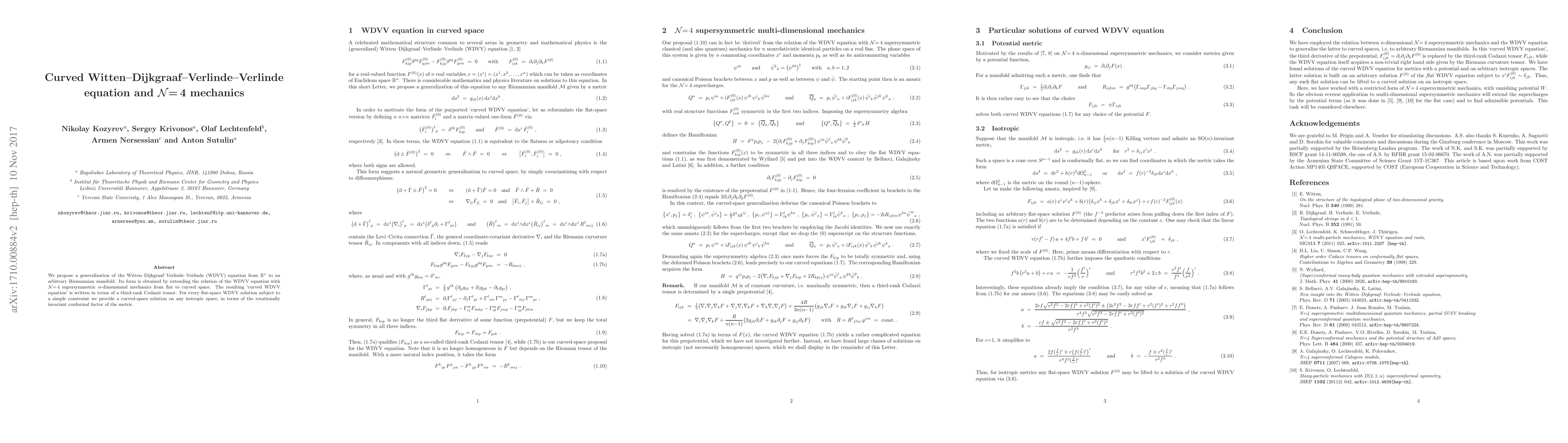 This paper generalizes the Witten-Dijkgraaf-Verlinde-Verlinde (WDVV) equation from flat to curved Riemannian space, linking it to ${\cal N}=4$ supersymmetric mechanics. The proposed "curved WDVV equation" utilizes a third-rank Codazzi tensor and extends flat-space WDVV solutions to isotropic curved spaces using the metric's conformal factor.