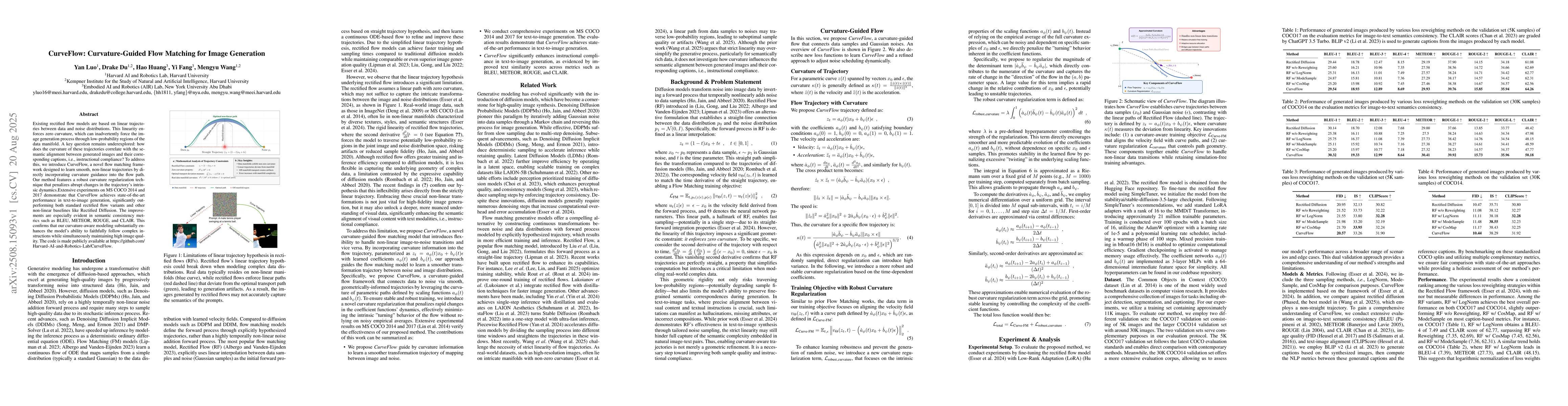 Existing rectified flow models are based on linear trajectories between data and noise distributions. This linearity enforces zero curvature, which can inadvertently force the image generation process through low-probability regions of the data manifold. A key question remains underexplored: how does the curvature of these trajectories correlate with the semantic alignment between generated images and their corresponding captions, i.e., instructional compliance? To address this, we introduce CurveFlow, a novel flow matching framework designed to learn smooth, non-linear trajectories by directly incorporating curvature guidance into the flow path. Our method features a robust curvature regularization technique that penalizes abrupt changes in the trajectory's intrinsic dynamics.Extensive experiments on MS COCO 2014 and 2017 demonstrate that CurveFlow achieves state-of-the-art performance in text-to-image generation, significantly outperforming both standard rectified flow variants and other non-linear baselines like Rectified Diffusion. The improvements are especially evident in semantic consistency metrics such as BLEU, METEOR, ROUGE, and CLAIR. This confirms that our curvature-aware modeling substantially enhances the model's ability to faithfully follow complex instructions while simultaneously maintaining high image quality. The code is made publicly available at https://github.com/Harvard-AI-and-Robotics-Lab/CurveFlow.