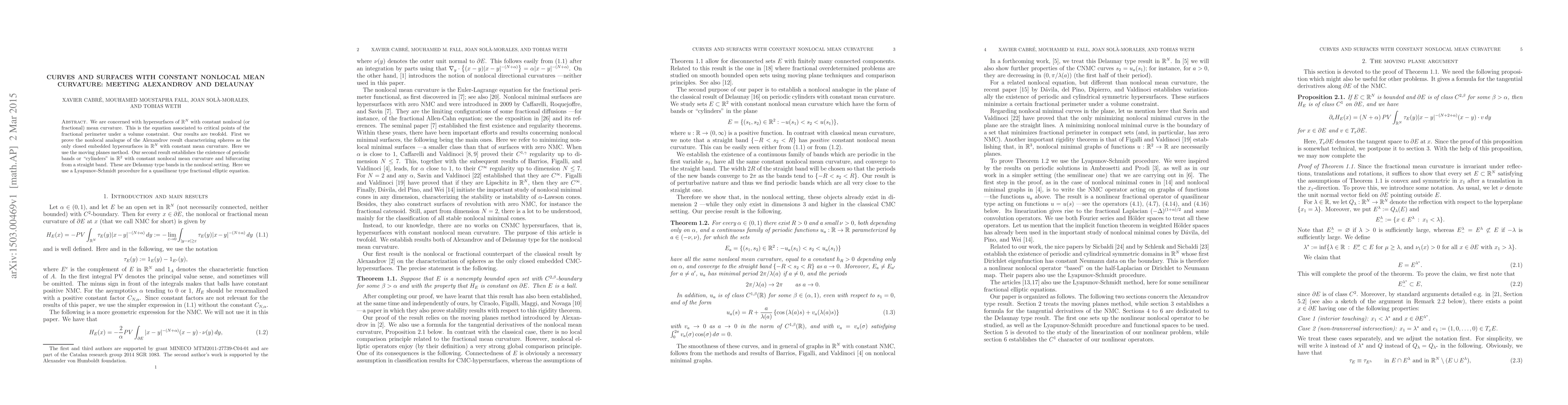 We are concerned with hypersurfaces of $\mathbb{R}^N$ with constant nonlocal (or fractional) mean curvature. This is the equation associated to critical points of the fractional perimeter under a volume constraint. Our results are twofold. First we prove the nonlocal analogue of the Alexandrov result characterizing spheres as the only closed embedded hypersurfaces in $\mathbb{R}^N$ with constant mean curvature. Here we use the moving planes method. Our second result establishes the existence of periodic bands or "cylinders" in $\mathbb{R}^2$ with constant nonlocal mean curvature and bifurcating from a straight band. These are Delaunay type bands in the nonlocal setting. Here we use a Lyapunov-Schmidt procedure for a quasilinear type fractional elliptic equation.