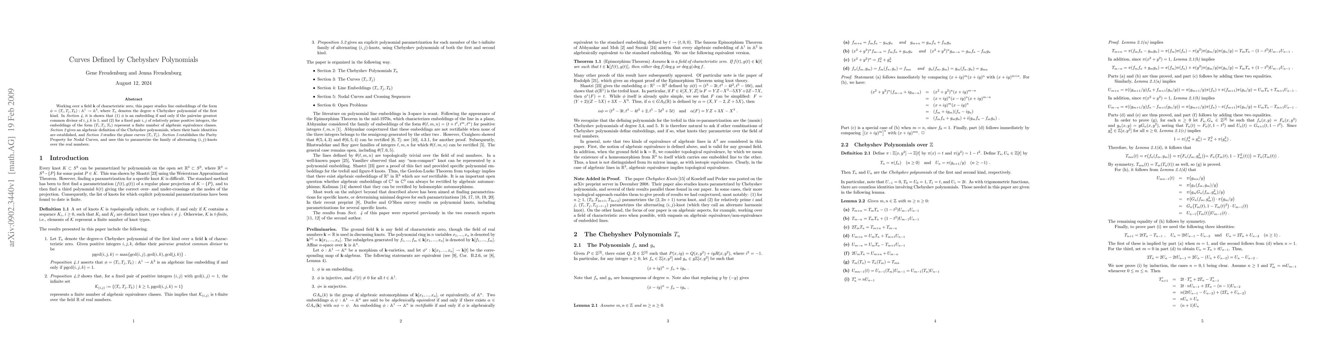 Working over a field $\kk$ of characteristic zero, this paper studies line embeddings of the form $\phi = (T_i,T_j,T_k):\A^1\to\A^3$, where $T_n$ denotes the degree $n$ Chebyshev polynomial of the first kind. In {\it Section 4}, it is shown that (1) $\phi$ is an embedding if and only if the pairwise greatest common divisor of $i,j,k$ is 1, and (2) for a fixed pair $i,j$ of relatively prime positive integers, the embeddings of the form $(T_i,T_j,T_k)$ represent a finite number of algebraic equivalence classes. {\it Section 2} gives an algebraic definition of the Chebyshev polynomials, where their basic identities are established, and {\it Section 3} studies the plane curves $(T_i,T_j)$. {\it Section 5} establishes the Parity Property for Nodal Curves, and uses this to parametrize the family of alternating $(i,j)$-knots over the real numbers.