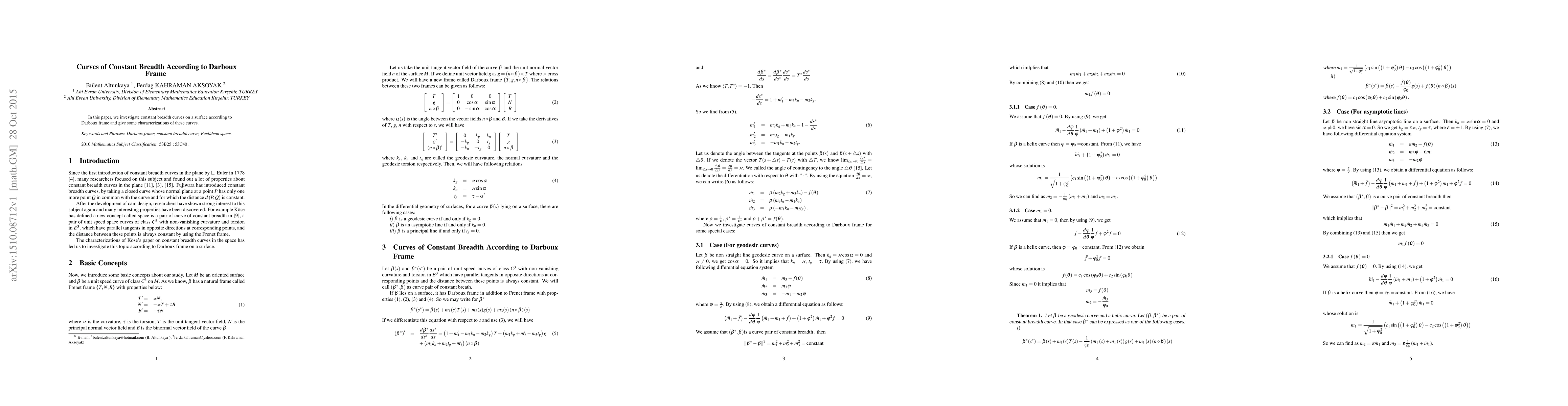 The paper presents a detailed analysis of constant breadth curves using the Darboux frame, deriving differential equations and solving them for specific curve types, providing explicit parametric forms for these curves.