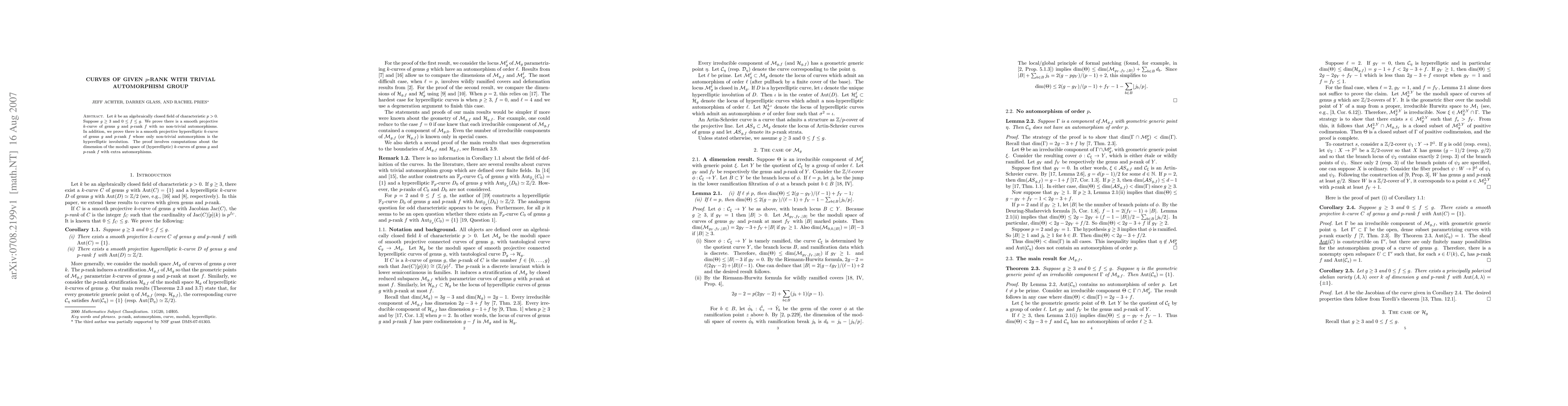 Let $k$ be an algebraically closed field of characteristic $p >0$. Suppose $g \geq 3$ and $0 \leq f \leq g$. We prove there is a smooth projective $k$-curve of genus $g$ and $p$-rank $f$ with no non-trivial automorphisms. In addition, we prove there is a smooth projective hyperelliptic $k$-curve of genus $g$ and $p$-rank $f$ whose only non-trivial automorphism is the hyperelliptic involution. The proof involves computations about the dimension of the moduli space of (hyperelliptic) $k$-curves of genus $g$ and $p$-rank $f$ with extra automorphisms.
