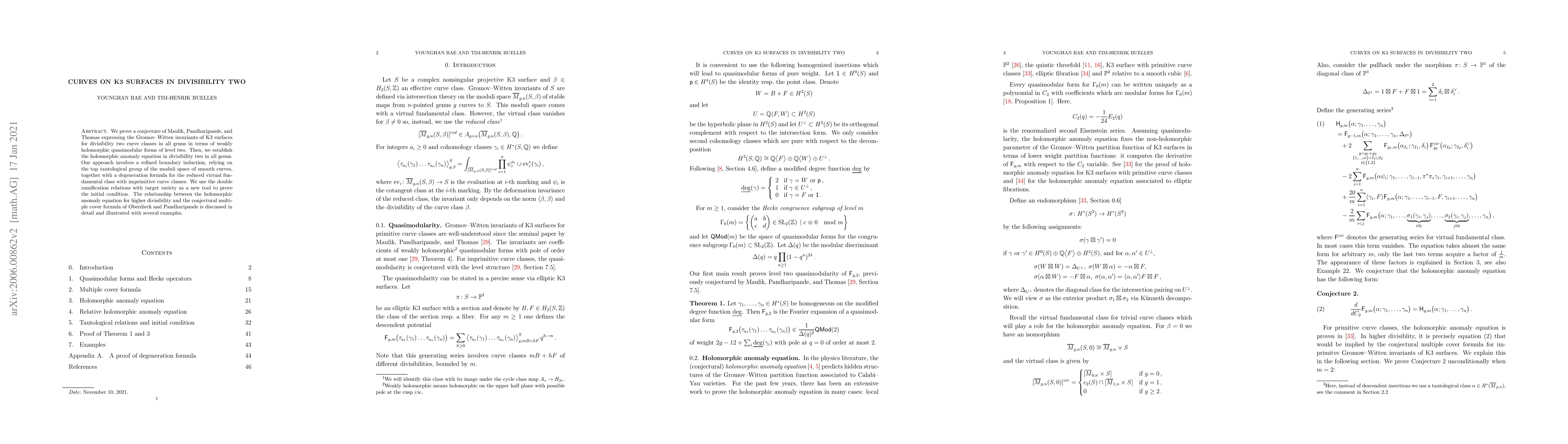 This paper proves a conjecture linking Gromov-Witten invariants of K3 surfaces for divisibility two curve classes to weakly holomorphic quasimodular forms of level two, and establishes the holomorphic anomaly equation for these invariants. The proof employs refined boundary induction and a new degeneration formula.