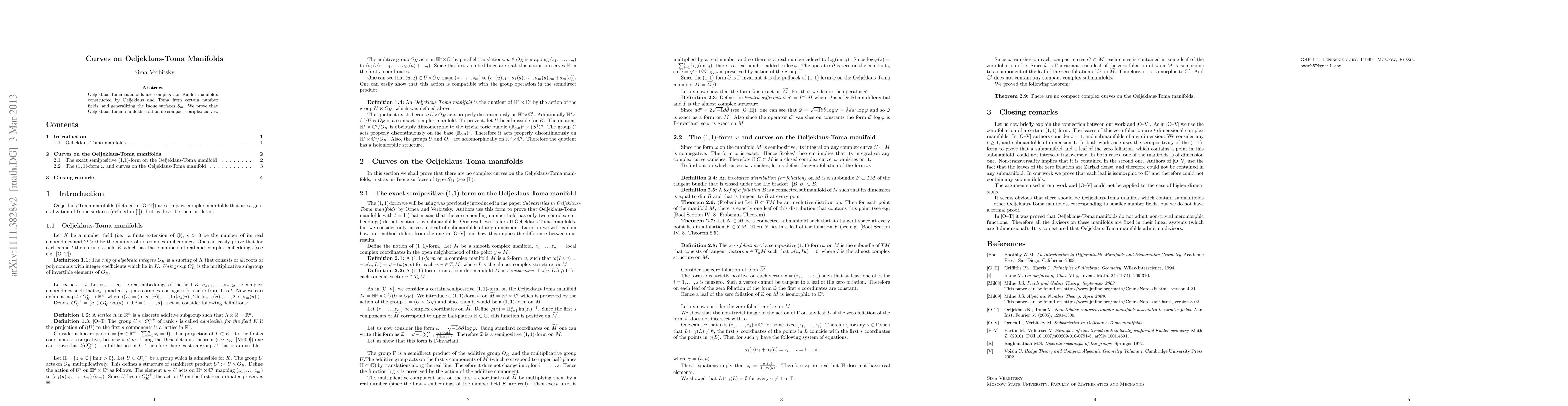 The paper proves that Oeljeklaus-Toma manifolds, complex non-Kähler manifolds derived from number fields, do not contain any compact complex curves. This result extends the understanding of these generalized Inoue surfaces.