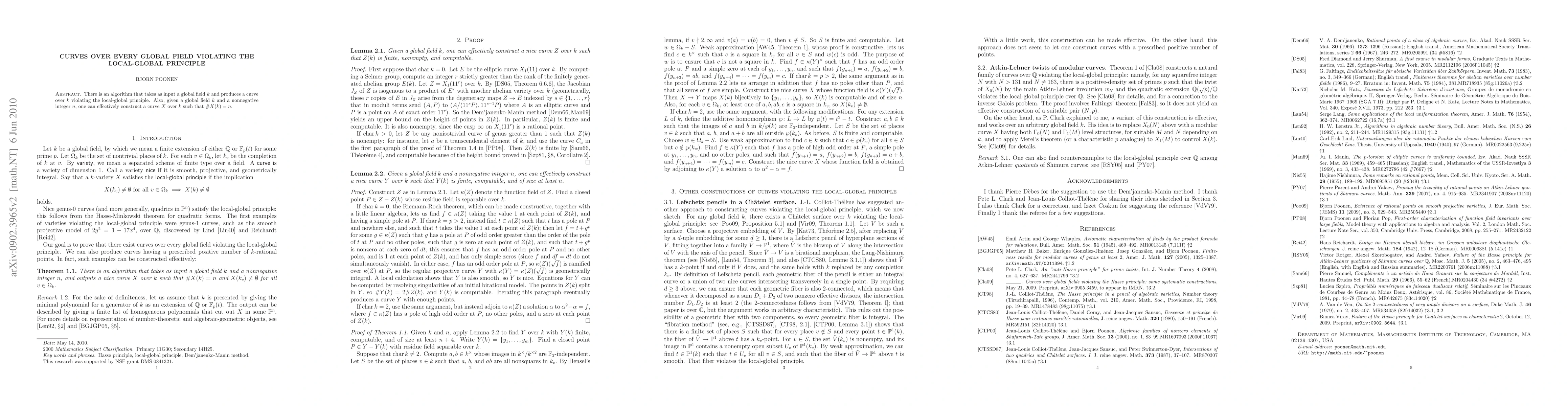 Summary: The paper presents an algorithm to construct curves over global fields that violate the local-global principle. It also describes how to effectively create curves with specified numbers of rational points while ensuring points over every completion of the field.