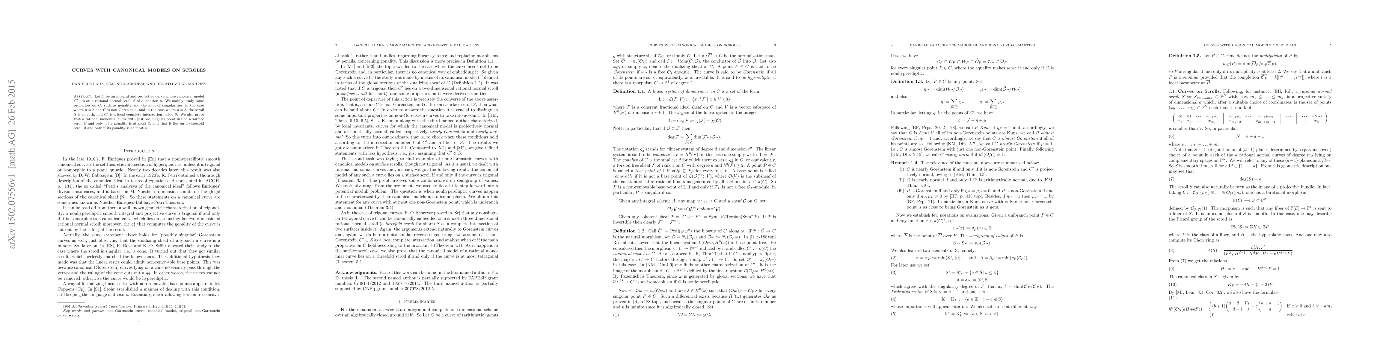 Let $C$ be an integral and projective curve whose canonical model $C'$ lies on a rational normal scroll $S$ of dimension $n$. We mainly study some properties on $C$, such as gonality and the kind of singularities, in the case where $n=2$ and $C$ is non-Gorenstein, and in the case where $n=3$, the scroll $S$ is smooth, and $C'$ is a local complete intersection inside $S$. We also prove that a rational monomial curve with just one singular point lies on a surface scroll if and only if its gonality is at most $3$, and that it lies on a threefold scroll if and only if its gonality is at most $4$.