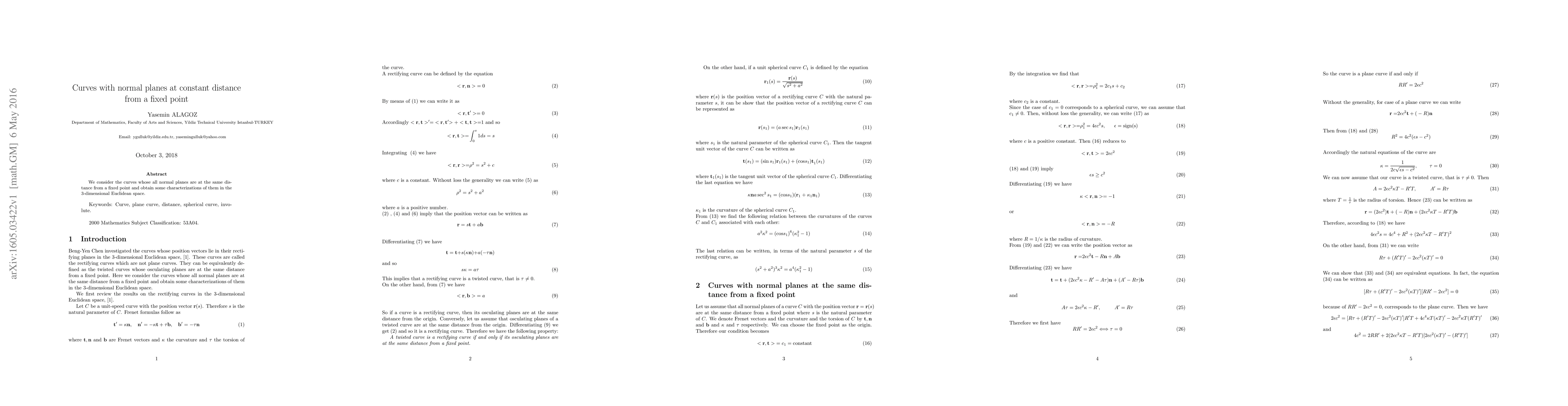 Summary: This paper characterizes curves in 3-dimensional Euclidean space where all normal planes maintain a constant distance from a fixed point, providing insights into their geometric properties and behavior.