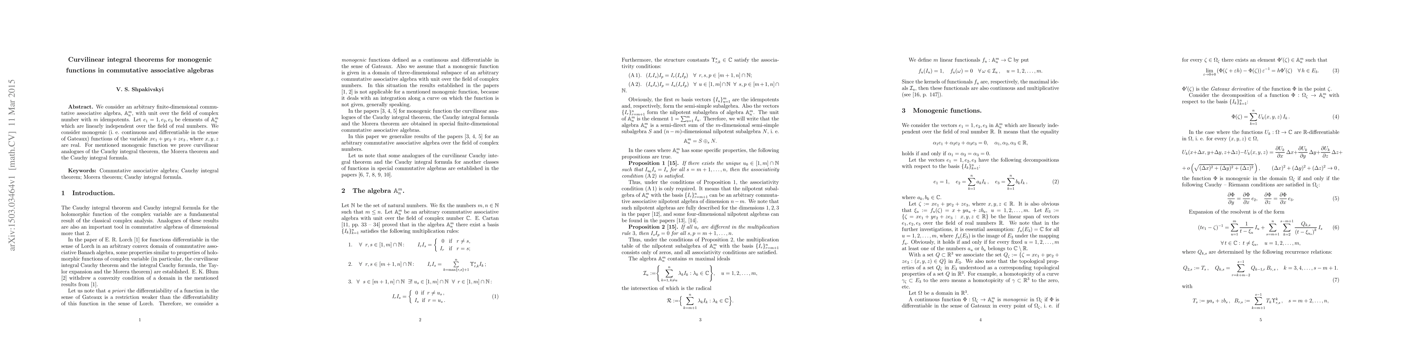 We consider an arbitrary finite-dimensional commutative associative algebra, $\mathbb{A}_n^m$, with unit over the field of complex number with $m$ idempotents. Let $e_1=1,e_2,e_3$ be elements of $\mathbb{A}_n^m$ which are linearly independent over the field of real numbers. We consider monogenic (i.e. continuous and differentiable in the sense of Gateaux) functions of the variable $xe_1+ye_2+ze_3$, where $x,y,z$ are real. For mentioned monogenic function we prove curvilinear analogues of the Cauchy integral theorem, the Morera theorem and the Cauchy integral formula.