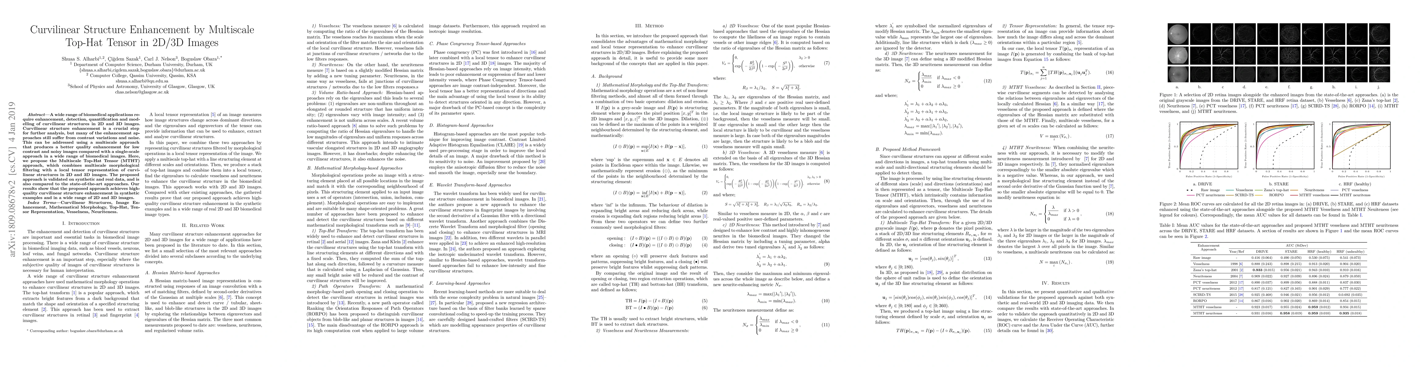 The paper proposes the Multiscale Top-Hat Tensor (MTHT) approach for enhancing curvilinear structures in 2D and 3D images, combining multiscale morphological filtering with a local tensor representation. The MTHT approach is shown to outperform state-of-the-art methods in enhancing low contrast and noisy biomedical images.