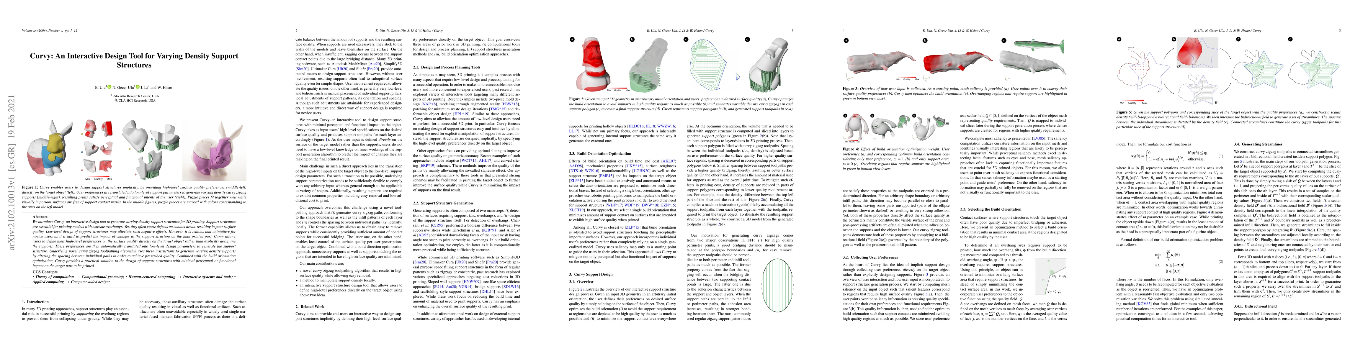 Curvy is an interactive design tool for generating varying density support structures for 3D printing, aiming to improve surface quality by allowing users to set high-level preferences that are automatically translated into optimized low-level support designs. Its innovative zigzag toolpathing algorithm and build orientation optimization minimize the impact on the final printed part.